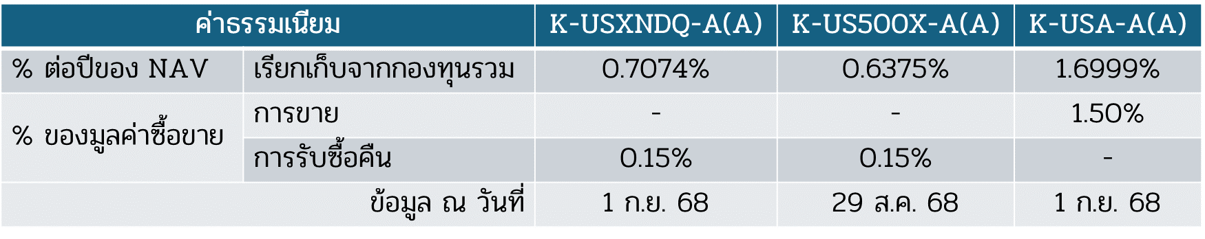 - K-USXNDQ-A(A): ป้องกันความเสี่ยง ไม่น้อยกว่า 75% ของเงินลงทุนต่างประเทศ