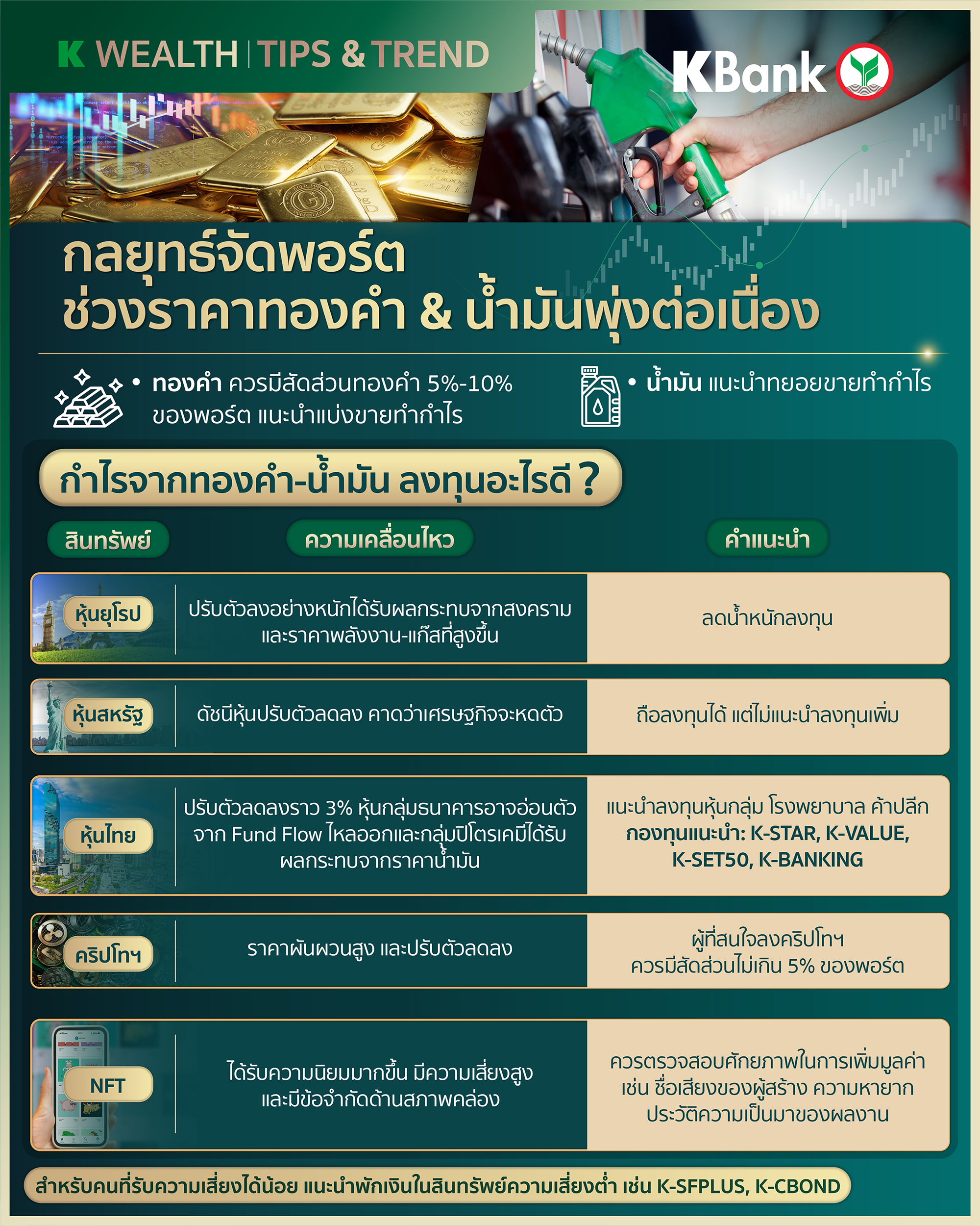 คำแนะนำการลงทุน สำหรับทองคำและน้ำมันที่ปรับขึ้นแรงทองคำในระยะยาว แนะนำให้มีสัดส่วน 5-10% ของพอร์ต หากมีสัดส่วนทองเยอะกว่า 5-10% แนะนำให้ทยอยลดสัดส่วนลง
