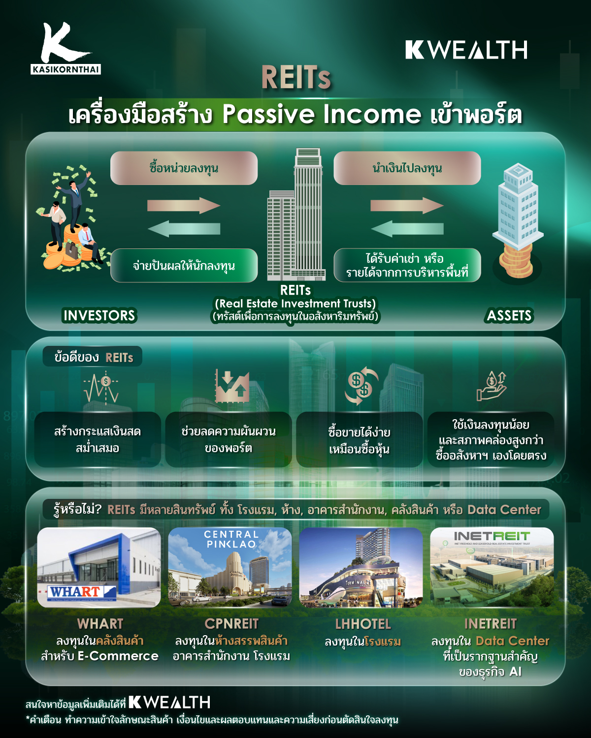 ในครั้งถัดไป K WEALTH จะมานำเสนอประเด็นเพิ่มเติมเกี่ยวกับ REITs ทั้งมุมมองด้านความเสี่ยง ปัจจัยที่ควรพิจารณาในการเลือกลงทุน รวมถึงการเปรียบเทียบกับสินทรัพย์ที่สร้างกระแสเงินสดประเภทอื่น ว่า REITs มีจุดเด่นและข้อจำกัดอย่างไร
