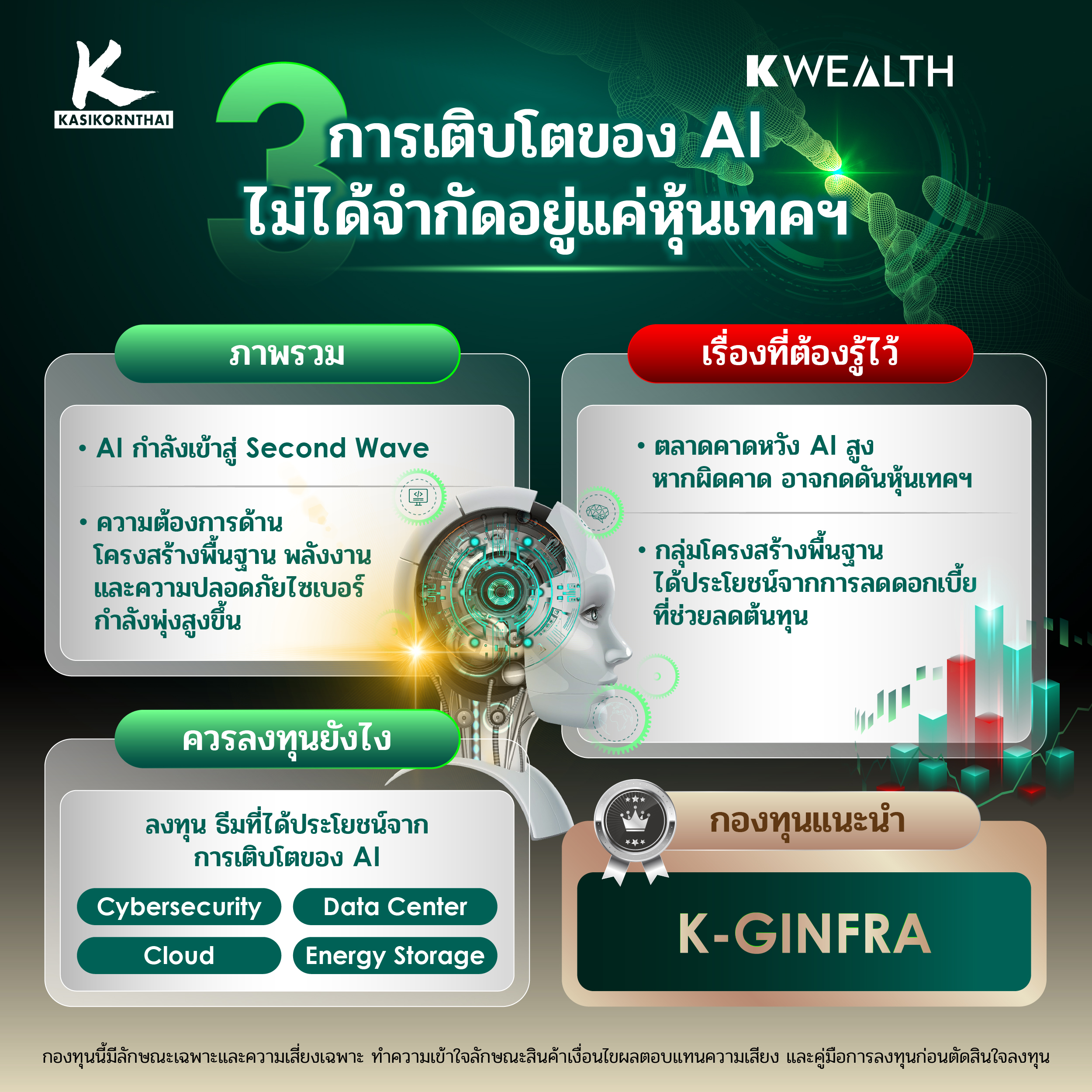 แนะนำให้เลือกลงทุน Global Infrastructure และเน้นธีมที่ได้ประโยชน์จากการเติบโตของ AI เช่น Cybersecurity, Cloud, Data Center รวมถึงอุปกรณ์ที่เกี่ยวข้อง และกลุ่มพลังงานพร้อมระบบกักเก็บ (Energy Storage)
