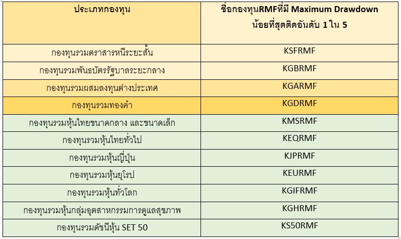 จากการสำรวจข้อมูล Maximum Drawdown ของกองทุน RMF ที่มีอายุตั้งแต่ 5 ปีขึ้นไป พบว่ามีกองทุนของบลจ.กสิกรไทยติดอันดับ 1 ใน 5 กองทุนที่ MDD น้อยที่สุดในแต่ละกลุ่ม เมื่อเทียบกับกองทุนบลจ.อื่นๆดังนี้