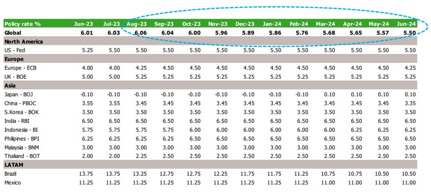 แนวโน้มนโยบายการเงินทั่วโลก หลังจากที่หลายประเทศได้ใช้นโยบายการเงินแบบเข้มงวดโดยการคงอัตราดอกเบี้ยไว้ในระดับสูง (จากภาพที่1) เพื่อควบคุมภาวะเงินเฟ้อที่เพิ่มขึ้นอย่างรวดเร็วในช่วงที่ผ่านมา ขณะนี้สถานการณ์เริ่มเปลี่ยนแปลงเมื่อเงินเฟ้อในหลายประเทศเริ่มปรับตัวลงใกล้ระดับ 2% ซึ่งเป็นเป้าหมายที่ธนาคารกลางหลายแห่งตั้งไว้ โดยเฉพาะอย่างยิ่งธนาคารกลางยุโรป (ECB) ที่ได้มีการปรับลดอัตราดอกเบี้ยลงมาเหลือ 4.25% ในการประชุมล่าสุดเมื่อเดือนมิถุนายนที่ผ่านมา นับเป็นการปรับลดครั้งแรกในรอบเกือบ 5 ปี ขณะที่ธนาคารกลางสหรัฐ (Fed) ก็ได้แสดงความพร้อมที่จะลดอัตราดอกเบี้ยหากทิศทางของเงินเฟ้อและเศรษฐกิจเป็นไปตามที่คาดการณ์ไว้ในการประชุมเมื่อเดือนสิงหาคม สะท้อนถึงอัตราดอกเบี้ยนโยบายทั่วโลกกำลังผ่านระดับสูงสุดและเตรียมจะปรับลง
