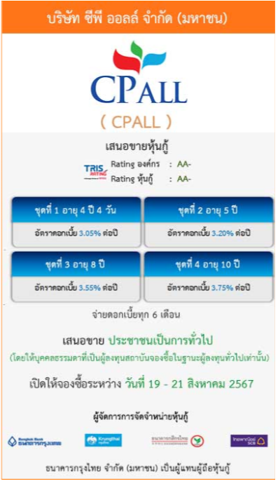 2.1.บริษัท ซีพี ออลล์ (CPALL) ได้เปิดเสนอขายให้แก่ประชาชนทั่วไปทั้งหมด 4 ชุด Rating หุ้นกู้ AA- โดยมีระยะเวลาตั้งแต่ 4 ปี ถึง 10 ปี โดยจ่ายดอกเบี้ยทุก 6 เดือน อัตราดอกเบี้ยเริ่มต้นที่ 3.05% ถึง 3.75% ขึ้นอยู่กับระยะเวลาถือครอง (ยังไม่หักภาษี ณ ที่จ่าย 15%) เปิดให้จองซื้อระหว่างวันที่ 19-21 สิงหาคม 2024