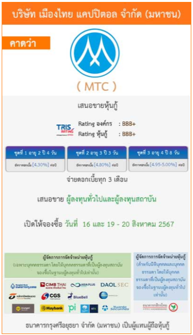 2.2.บริษัท เมืองไทย แคปปิตอล (MTC) ได้เปิดเสนอขายให้แก่ประชาชนทั่วไปทั้งหมด 3 ชุด Rating หุ้นกู้ BBB+ โดยมีระยะเวลาตั้งแต่ 2 ปี ถึง 4 ปี โดยจ่ายดอกเบี้ยทุก 3 เดือน อัตราดอกเบี้ยเริ่มต้นที่ 4.30% ถึง 4.95% ขึ้นอยู่กับระยะเวลาถือครอง (ยังไม่หักภาษี ณ ที่จ่าย 15%) เปิดให้จองซื้อระหว่าง 16 และ 19 - 20 สิงหาคม 2024