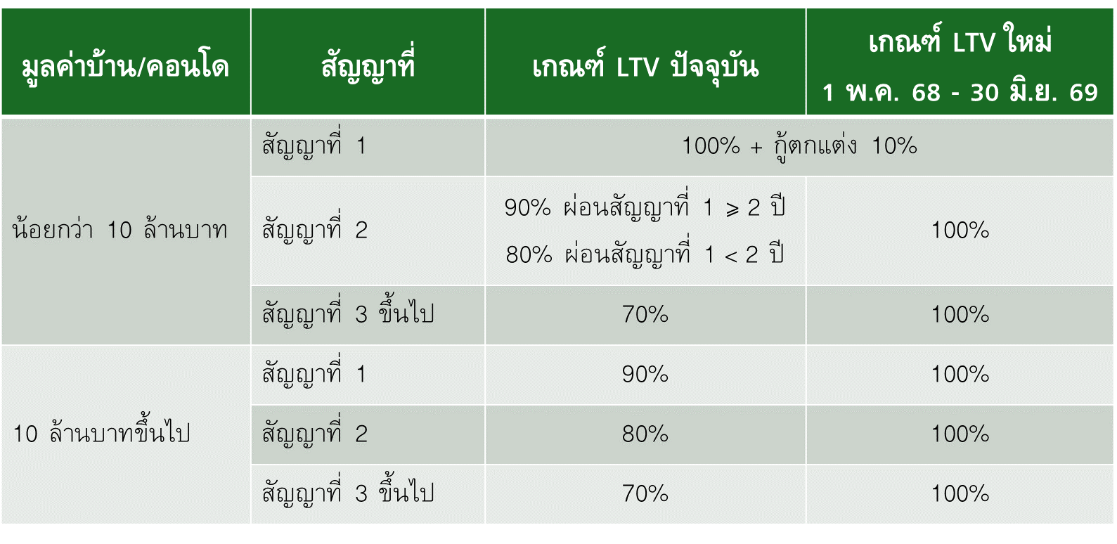 เกณฑ์ LTV ใหม่ที่ ธปท. จะเริ่มใช้สำหรับสัญญาเงินกู้ที่ทำตั้งแต่วันที่ 1 พ.ค. 68 – 30 มิ.ย. 69 นั้น มีการผ่อนปรนจากเกณฑ์ที่ใช้อยู่ในปัจจุบันดังนี้