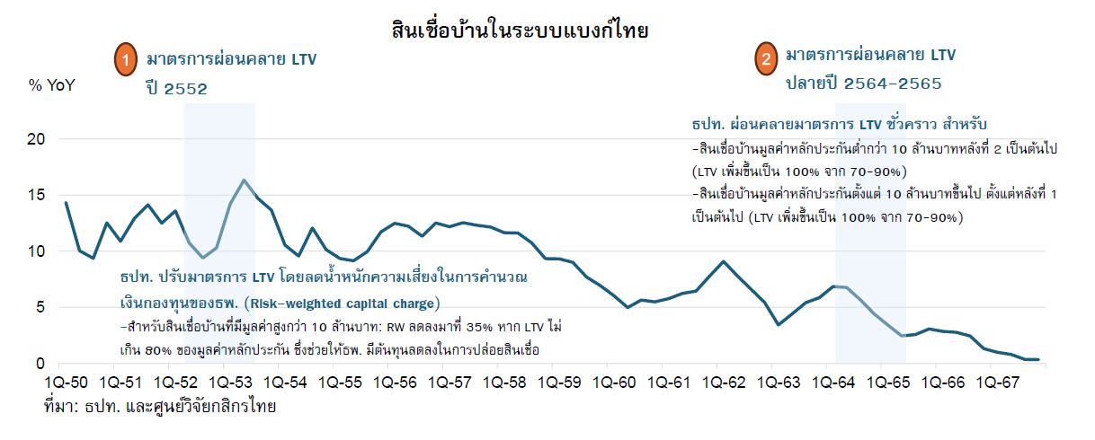 อ้างอิงข้อมูลจากศูนย์วิจัยกสิกรไทย (KResearch) ณ 21 ก.พ. 68 มองว่าการผ่อนปรนมาตรการ LTV อาจช่วยกระตุ้นโอกาสการปล่อยสินเชื่อใหม่ โดยเฉพาะในกลุ่มลูกค้าที่มีรายได้ระดับปานกลางถึงสูงที่ธนาคารสามารถจัดการความเสี่ยงด้านเครดิตได้ อย่างไรก็ดี มองว่าผลต่อสินเชื่อบ้านโดยรวมยังอยู่ในกรอบจำกัด เพราะเศรษฐกิจไทยในภาพใหญ่ที่ฟื้นตัวช้า มีผลต่อรายได้ อำนาจซื้อ และหนี้สินของภาคครัวเรือน ซึ่งสอดคล้องกับมุมมองของทางหลักทรัพย์กสิกรไทย (KSecurities) ณ 21 มี.ค. 68 ที่มองว่าการผ่อนปรนมาตรการ LTV ไม่ได้เพิ่มความเสี่ยงต่อเสถียรภาพระบบการเงินมากนัก เนื่องจากในปัจจุบันภาวะการเงินตึงตัวและสถาบันการเงินระมัดระวังในการให้สินเชื่อ โดยคาดบริษัทจดทะเบียนจะได้ประโยชน์เชิง sentiment (ความเชื่อมั่น/ความรู้สึก) เป็นหลัก แต่ยังขาดปัจจัยสนับสนุนเชิงพื้นฐาน