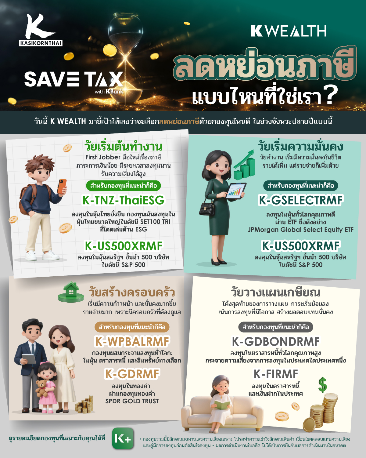 อาชีพการงานเริ่มก้าวหน้า มีรายได้เพิ่มขึ้น แต่รายจ่ายก็เพิ่มตามด้วย แนะนำลงทุนลดหย่อนภาษีให้เหมาะสมกับการจัดการใช้จ่ายในอนาคต กองทุนที่แนะนำคือ
