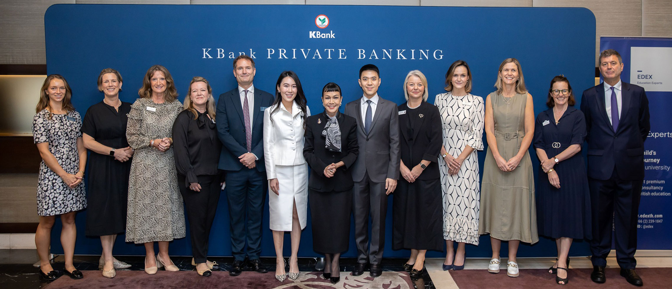 นางมัทนวัลย์ สมุทรักษ์ โอคส์ (ที่ 7 จากซ้าย) Senior Executive Director – Marketing Expert, Private Banking Group ธนาคารกสิกรไทย และ ดร. ชินวัฒน์ สกุลตั้งไพศาล (ที่ 6 จากขวา) Head of Consultant, EDEX- Education Experts ร่วมจัดงานสัมมนา “Top British Schools: The Elite Educational Experience” กิจกรรมพิเศษสำหรับลูกค้า KBank Private Banking โดยมี Admission Directors จาก 7 โรงเรียนชั้นนำของสหราชอาณาจักร ได้แก่ Brighton College, Cheltenham Ladies’ College, Downe House School, Radley College, Rugby School, Tonbridge School และ Wycombe Abbey ร่วมแบ่งปันแนวทางการคัดเลือกนักเรียน พร้อมแนะนำการเตรียมตัวที่เหมาะสมสำหรับการเข้าศึกษาต่อในสหราชอาณาจักร โดยเชื่อมั่นว่าการวางแผนการศึกษาเป็นการลงทุนอีกรูปแบบหนึ่งที่สำคัญและสามารถสร้างรากฐานที่แข็งแกร่งภายในครอบครัวเพื่อชีวิตที่มั่งคั่งและสมดุลในทุกมิติ ณ โรงแรม เดอะ เซนต์ รีจิส กรุงเทพ เมื่อเร็ว ๆ นี้