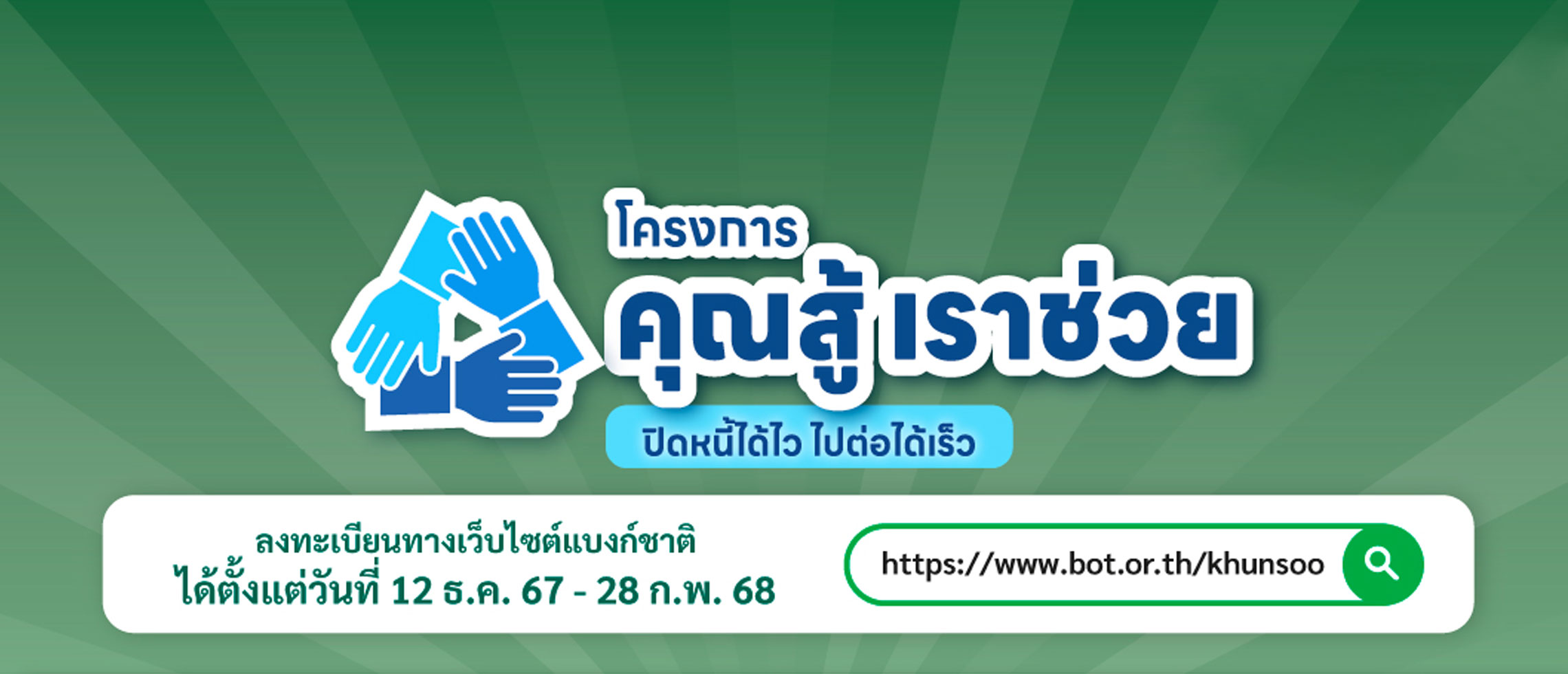 นายจงรักกล่าวทิ้งท้ายว่า ธนาคารพร้อมอยู่เคียงข้างให้ความช่วยเหลือลูกค้าอย่างเต็มที่ในทุกสถานการณ์ และมุ่งหวังให้ลูกค้าแก้หนี้อย่างยั่งยืน เพื่อสามารถดำเนินชีวิตและธุรกิจต่อไปได้ ลูกค้าสามารถลงทะเบียนเข้าร่วมโครงการ “คุณสู้ เราช่วย" ได้ตั้งแต่วันที่ 12 ธันวาคม 2567 - 28 กุมภาพันธ์ 2568 ที่เว็บไซต์ของธนาคารแห่งประเทศไทย www.bot.or.th/khunsoo และเมื่อลงทะเบียนสำเร็จ ธนาคารจะเริ่มติดต่อลูกค้าตั้งแต่ 2 มกราคม 2568 เป็นต้นไป ติดต่อสอบถามรายละเอียดเพิ่มเติมได้ที่ K-Contact Center 02-8888888 กด 99 หรือสายด่วนแบงก์ชาติ โทร.1213