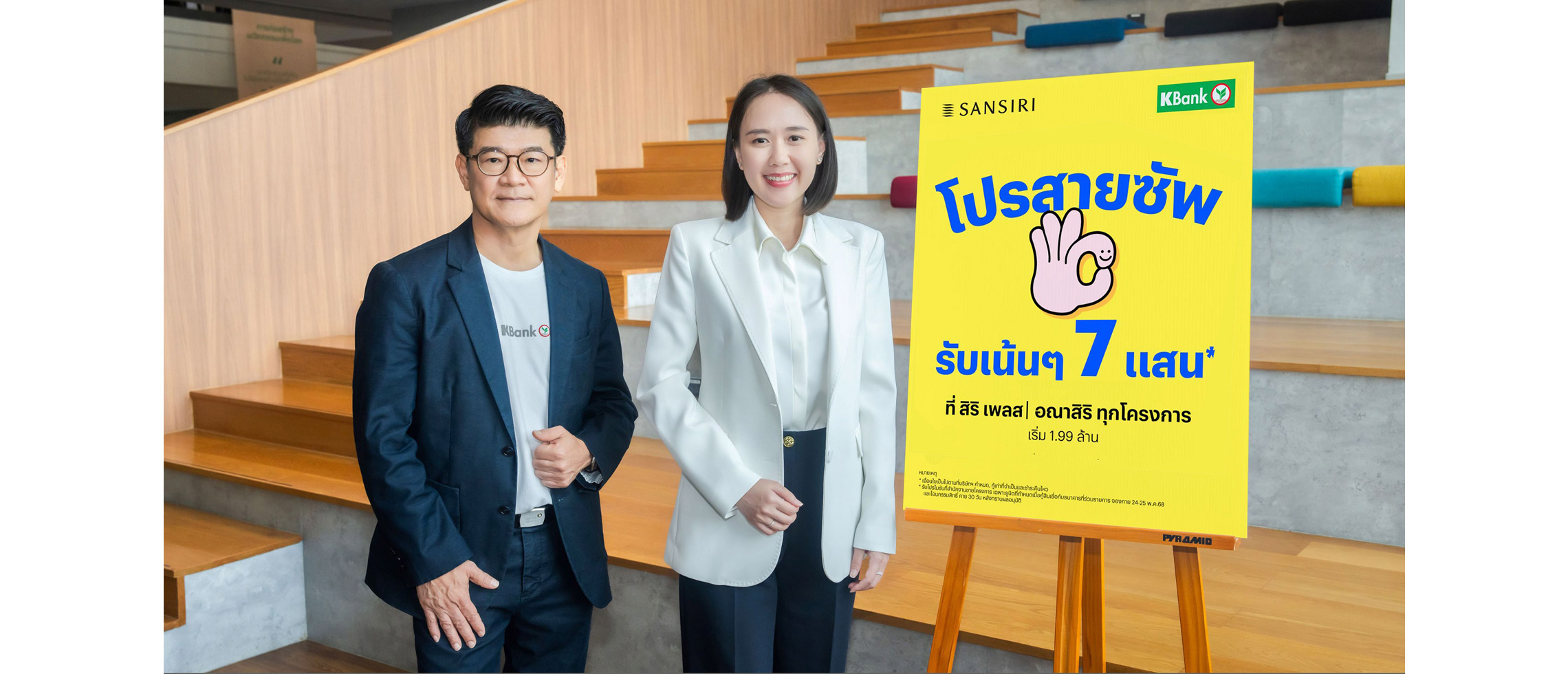 นายอภิรัตน์ สังขรัตน์ ผู้อำนวยการฝ่ายอาวุโส ฝ่ายบริหารผลิตภัณฑ์และการตลาดสินเชื่อที่อยู่อาศัยและสินเชื่อบุคคลแบบมีหลักประกัน ธนาคารกสิกรไทย และนางสาวภัคพริ้ง การุญ รองผู้อำนวยการฝ่าย การตลาดโครงการแนวราบ บริษัท แสนสิริ จำกัด (มหาชน) จับมือร่วมกันจัดโปรโมชันสนับสนุน และช่วยสานฝันคนอยากมีบ้าน ให้ลูกค้ารับโปรโมชันสินเชื่อบ้านธนาคารกสิกรไทยผ่อนต่ำ 2 ปี ล้านละ 2,500 บาทต่อเดือน*** พร้อมอัตราดอกเบี้ยเริ่มต้น 2.25% 2 ปีแรก** และโปรโมชันจากแสนสิริ บ้านราคาพิเศษเริ่มต้น 1.99 ล้านบาท (เฉพาะบางยูนิตในโครงการที่ร่วมรายการ) รับเงินคืนสูงสุด 7 แสนบาท* โดยธนาคารกสิกรไทยและแสนสิริตั้งเป้าหมายให้ความร่วมมือครั้งนี้ช่วยเพิ่มโอกาสให้กับลูกค้าได้เป็นเจ้าของบ้านในโครงการคุณภาพจากแสนสิริได้ง่ายและสะดวกยิ่งขึ้น ผู้ที่สนใจสามารถเข้าร่วมโปรโมชันได้ตั้งแต่วันที่ 24 พ.ค. – 30 มิ.ย. 68 ที่โครงการอณาสิริ และสิริ เพลส ทั้ง 39 ทำเลทั่วประเทศ หรือสอบถามรายละเอียดเพิ่มเติมที่ K-Contact Center 02-8888888