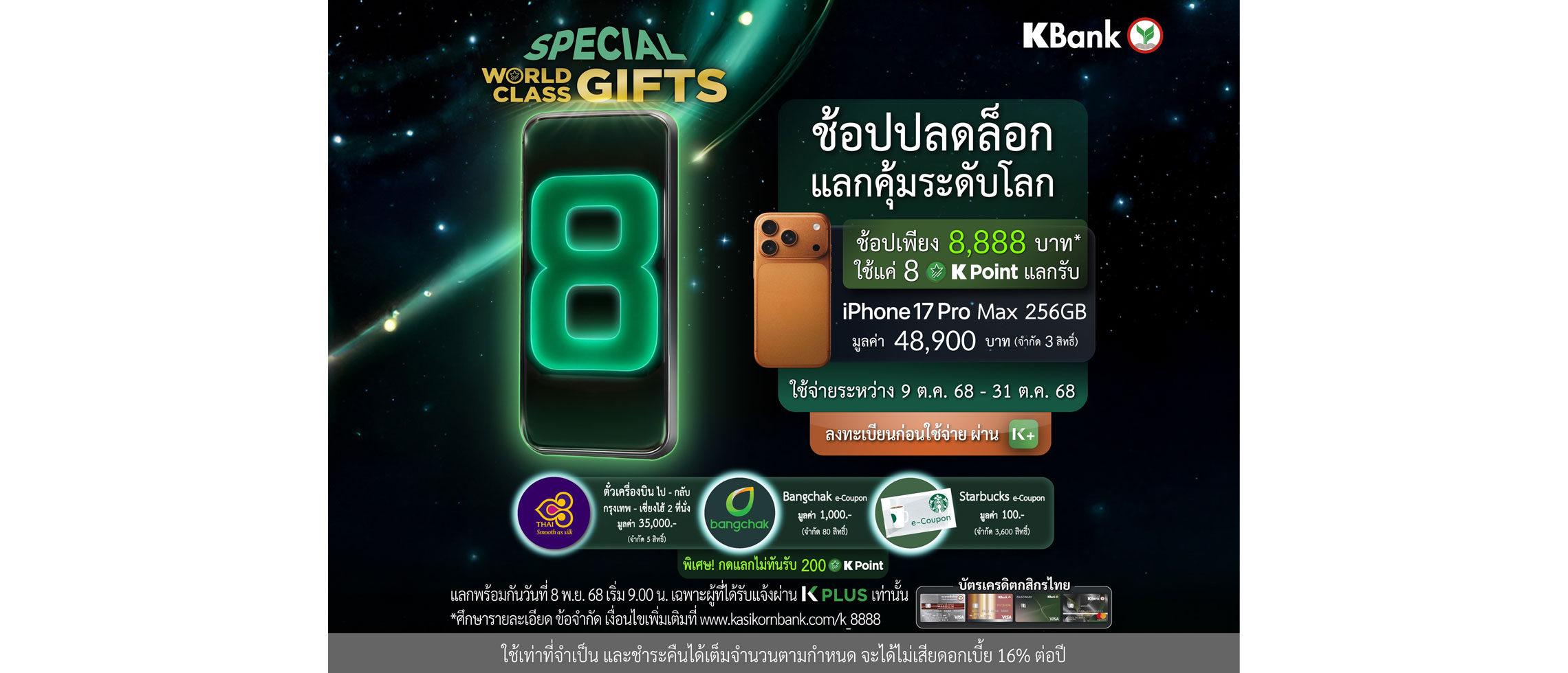 บัตรเครดิตกสิกรไทย จัดเต็มให้ลูกค้ารับความคุ้มครั้งใหม่กับแคมเปญ Special WORLD CLASS GIFTS: ช้อปปลดล็อก แลกคุ้มระดับโลก* จัดโปรโมชั่นพิเศษ เพียงลงทะเบียนก่อนใช้จ่ายผ่าน K PLUS และใช้จ่ายสะสมผ่านบัตรเครดิตกสิกรไทย ครบ 8,888 บาท* ในหมวดสินค้าที่ร่วมรายการ ระหว่างวันที่ 9 ตุลาคม 2568 – 31 ตุลาคม 2568 รับสิทธิ์ใช้ K Point แค่ 8 คะแนน แลกรับสินค้าแบรนด์ดัง
