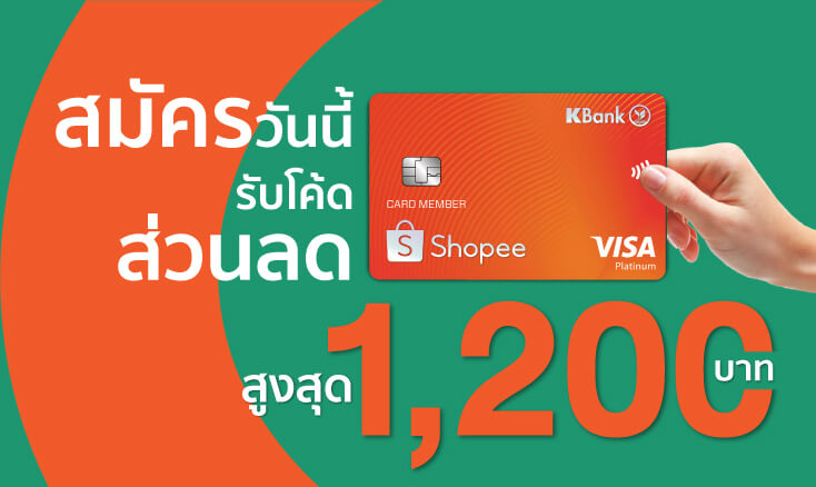 ลูกค้าใหม่สมัครบัตรเครดิต KBank - Shopee Credit Card บัตรหลักหรือบัตรเสริมใบแรก และมียอดการใช้จ่ายตั้งแต่ 1 ครั้งขึ้นไปใน Shopee Thailand ภายใน 30 วันหลังจากวันที่บัตรได้รับอนุมัติ รับโค้ดส่วนลด Shopee รวมมูลค่า 600 บาท