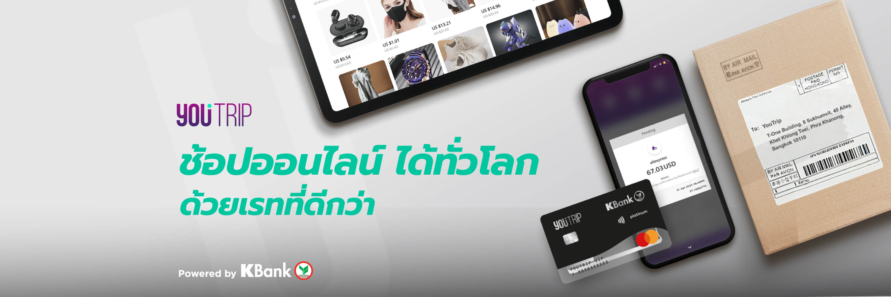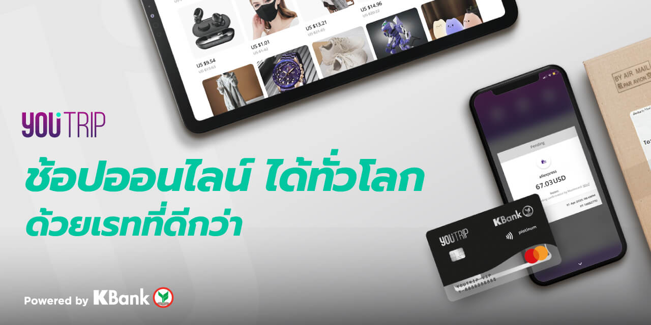 1. ดาวน์โหลดแอป YouTrip ผ่านทาง App Store หรือ Google Play Store หลังจากนั้นกดเข้าแอป เพื่อเริ่มขั้นตอนการสมัคร 2. ใส่หมายเลขโทรศัพท์มือถือเพื่อรับ OTP กรอก OTP ที่ได้รับ เพื่อความสะดวกในการใช้บริการ แนะนำให้ใช้หมายเลขโทรศัพท์มือถือเดียวกันกับที่ลงทะเบียนใช้งานแอป K PLUS 3. กด ""สมัครวันนี้ ฟรีค่าใช้จ่าย"" เพื่อสมัครบัตร พร้อมใส่หมายเลขบัตรประชาชนเพื่อเข้าสู่ขั้นตอนการลงทะเบียนผ่าน K PLUS โดยระบบจะทำการสลับไปยังแอป K PLUS โดยอัตโนมัติ (สำหรับใครที่ยังไม่มีแอป K PLUS ต้องดาวน์โหลดและสมัครใช้งานก่อน) 4. เมื่อเข้าสู่แอป K PLUS ให้ตรวจสอบข้อมูลส่วนตัว ที่อยู่ในการจัดส่งเอกสาร อีเมลล์ บัญชีธนาคารที่จะใช้กับแอป YouTrip และข้อตกลงต่างๆ (หากข้อมูลที่อยู่ไม่ถูกต้องสามารถแก้ไขให้เป็นปัจจุบันได้) 5. กดยืนยันข้อมูล เมื่อข้อมูลครบถ้วนแล้ว คุณจะได้รับบัตร YouTrip ตามที่อยู่จัดส่งเอกสาร ภายใน 5 - 7 วันทำการ
