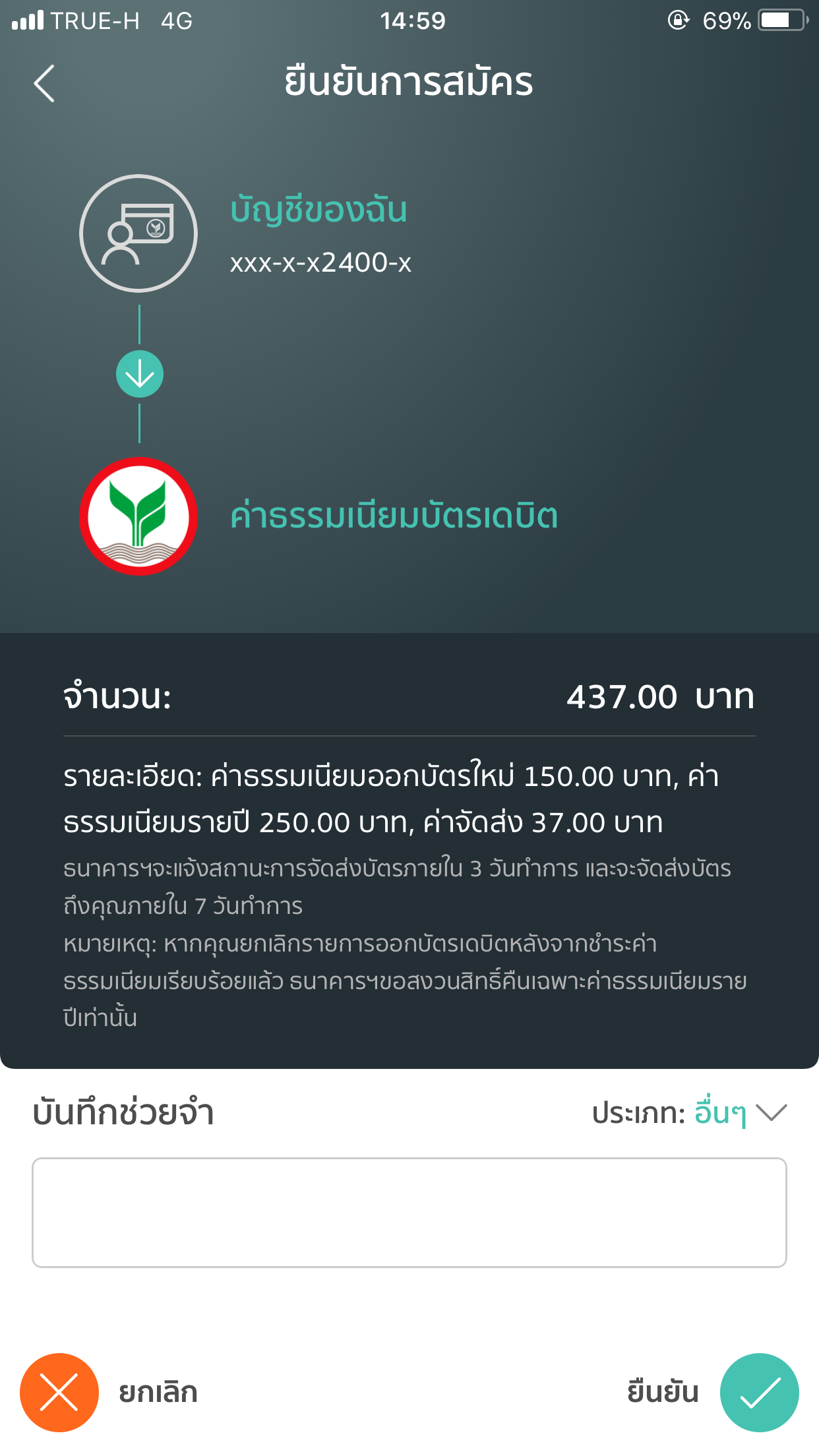 เลือก "ยอมรับเงื่อนไขสมัครบัตรเดบิต"