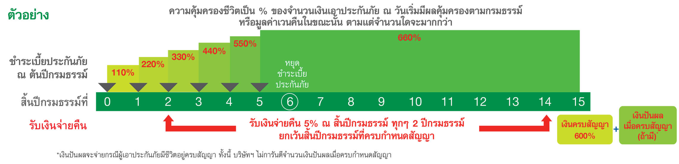 - สิ้นปีกรมธรรม์ปีที่ 2-14 รับเงินจ่ายคืน 5% ของจำนวนเงินเอาประกันภัย ทุกๆ 2 ปีกรมธรรม์