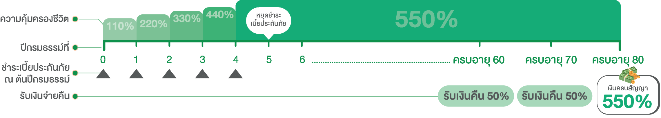 - ปีกรมธรรม์ที่ 5- อายุ 80 ปี: 550%
