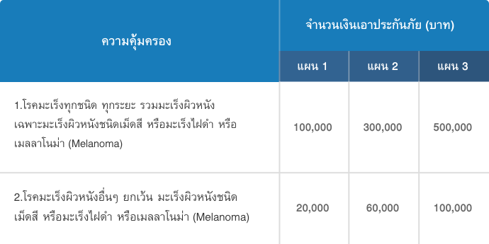 | 100,000 | 300,000 | 500,000 | - 2. โรคมะเร็งผิวหนังอื่นๆ ยกเว้น มะเร็งผิวหนังชนิดเม็ดสี หรือมะเร็งไฝดำ หรือเมลลาโนม่า (Melanoma)