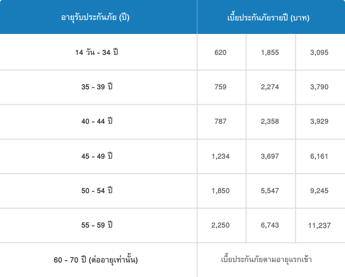 | 14 วัน - 34 ปี | 620 | 1,855 | 3,095 | | 35 - 39 ปี | 759 | 2,274 | 3,790 | | 40 - 44 ปี | 787 | 2,358 | 3,929 | | 45 - 49 ปี | 1,234 | 3,697 | 6,161 | | 50 - 54 ปี | 1,850 | 5,547 | 9,245 | | 55 - 59 ปี | 2,250 | 6,743 | 11,237 | | 60 - 70 ปี (ต่ออายุเท่านั้น) | เบี้ยประกันภัยตามอายุแรกเข้า |
