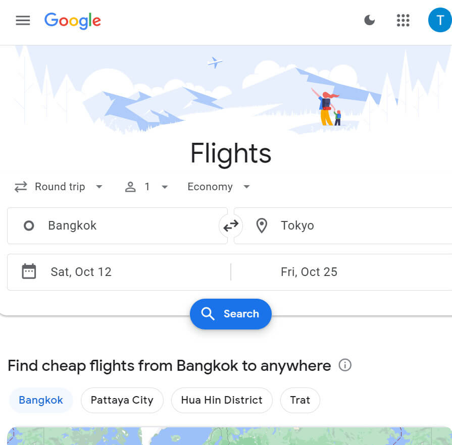 ตัวอย่างการเปรียบเทียบ ค้นหาเที่ยวบิน ผ่าน google flights โดยเลือกจุดหมายปลายทาง วันที่เดินทาง และโดยสามารถ filter รายละเอียดที่ต้องการ เช่น เที่ยวบินตรง การต่อเที่ยวบิน สัมภาระ สายการบิน จากนั้นทาง Google Flight จะแสดงเที่ยวบิน และ ราคา