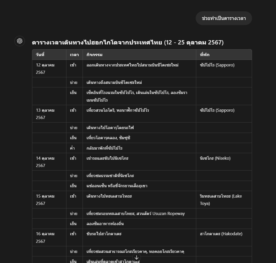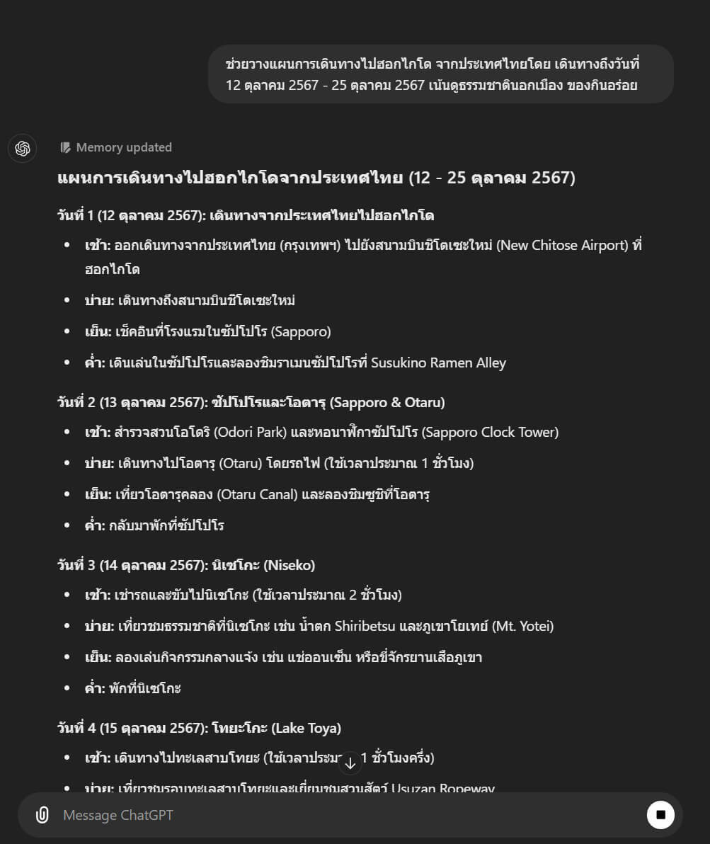 ปัจจุบันมีเครืองมือ Genarative AI เข้ามาช่วยอำนวยความสะดวก และพัฒนาขึ้นอย่างต่อเนื่อง เราสามารถนำเอาเครื่องมือนี้ วางแผนการเดินทางได้ ในที่นี่ขอยกตัวอย่าง ChatGPT โดยสามารถเขียนคำสั่งทีต้องการ (Prompt) ตัวอย่างเช่น ด้วย “ช่วยวางแผนการเดินทางไปฮอกไกโด จากประเทศไทยโดย เดินทางถึงวันที่ 12 ตุลาคม 2567 - 25 ตุลาคม 2567 เน้นดูธรรมชาตินอกเมือง ของกินอร่อย”