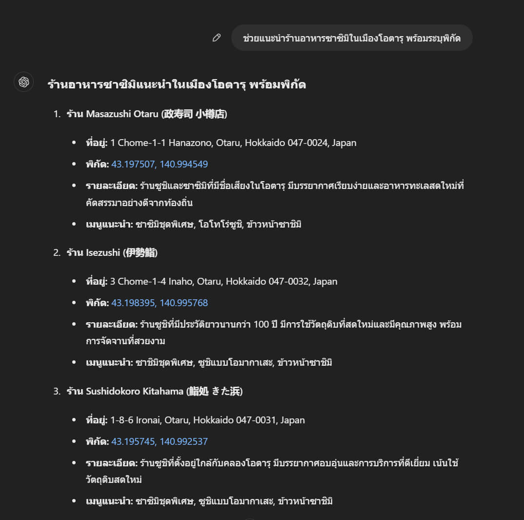 นอกจากนั้นยังมีคำสั่งอื่นๆ เพิ่มเติม ที่เราสามารถใช้ ChatGPT ช่วยได้ เช่น “ช่วยแนะนำร้านอาหารซาซิมิในเมืองโอตารุ พร้อมระบุพิกัด”