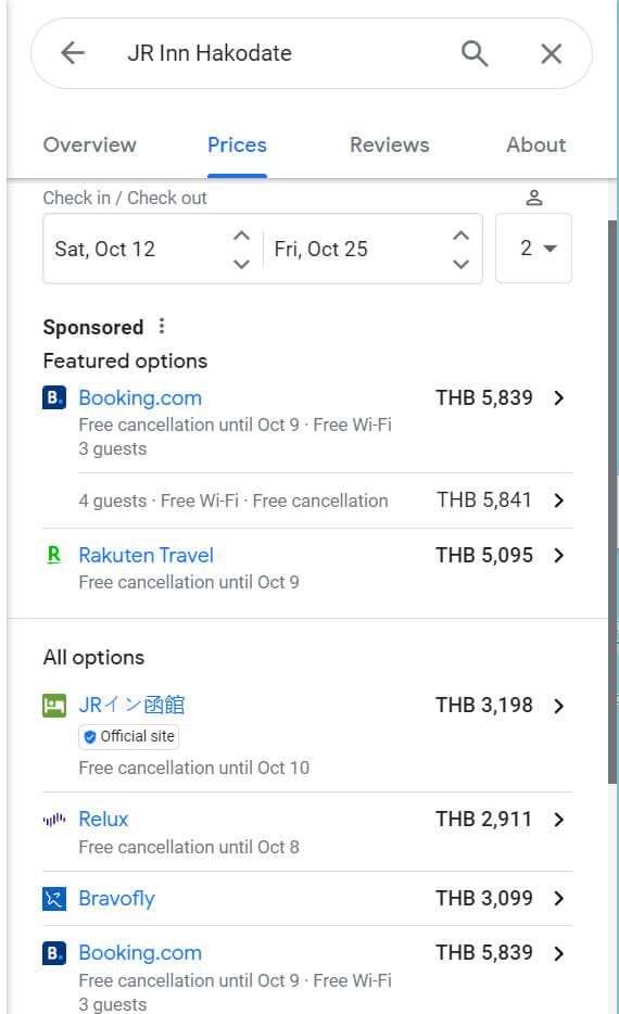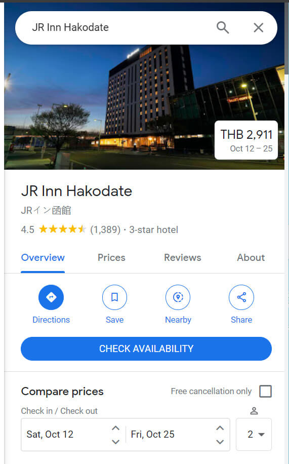 - ใช้เว็บไซต์เปรียบเทียบราคา: สามารถใช้ Google ดูราคาเบื้องต้นได้เปรียบเทียบกับหลายๆ platform ยกตัวอย่าง โดยการ search ชื่อ โรงแรมหรือที่พัก ที่ต้องการ ยกตัวอย่างในที่นี่ผม search “JR Inn Hakodate”