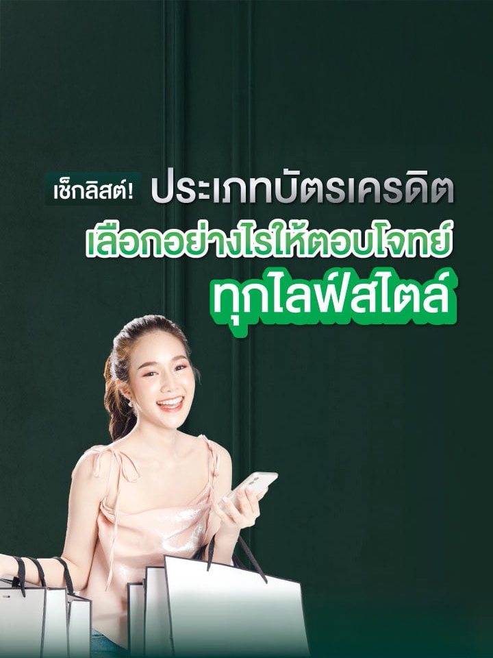 สำหรับใครที่สนใจอยากลองทำบัตรเครดิต ก่อนอื่นต้องสำรวจไลฟ์สไตล์ของตัวเองก่อนว่าแต่ละวันเราหมดเงินไปกับอะไรมากที่สุด เพราะบัตรเครดิตของทางธนาคารกสิกรไทยมีหลากหลายประเภท เช่น บัตรสำหรับคนชอบช็อปปิง คนชอบเที่ยว บัตรเติมน้ำมัน สะสมไมล์ บัตรสำหรับคนชอบกิน คนรักสุขภาพ หรือบัตรสำหรับลูกค้าบุคคลพิเศษ เพื่อตอบโจทย์การใช้ชีวิตให้การใช้จ่ายคล่องตัว และสามารถสร้างความสุขได้มากขึ้นไปอีก