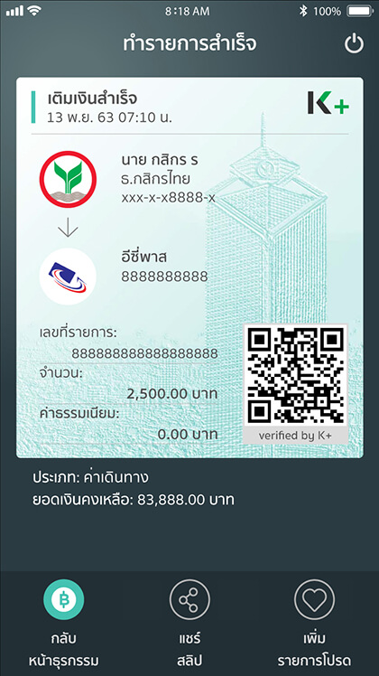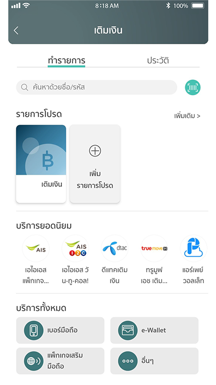 เติมเงินได้หลากหลาย ทั้งเบอร์มือถือ อีวอลเล็ต อีซี่พาส และผู้ให้บริการอื่น ๆ อีกมากมาย ทุกรายการมีหลักฐาน e-Slip บันทึกให้อัตโนมัติในอัลบั้มภาพ และแชร์ได้ผ่านโซเชียล เพื่อใช้เป็นหลักฐานในการทำธุรกรรม