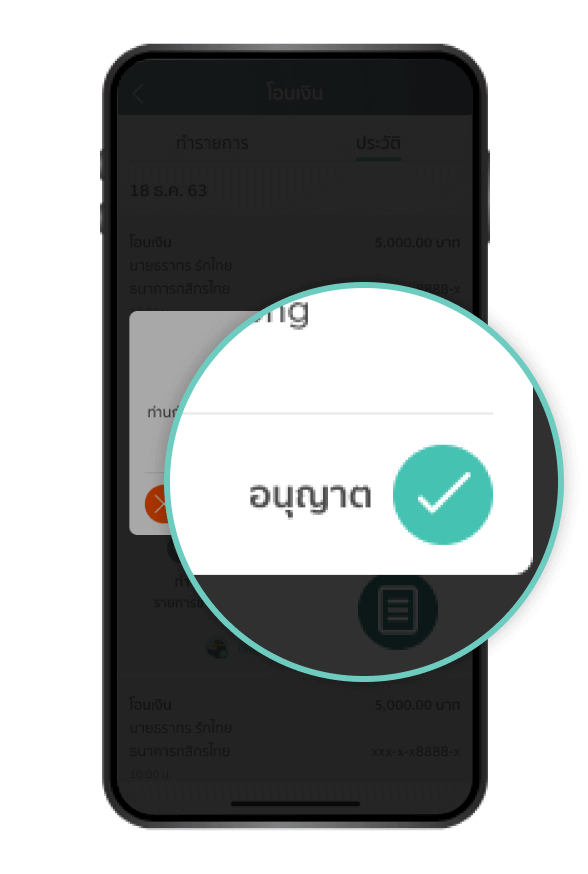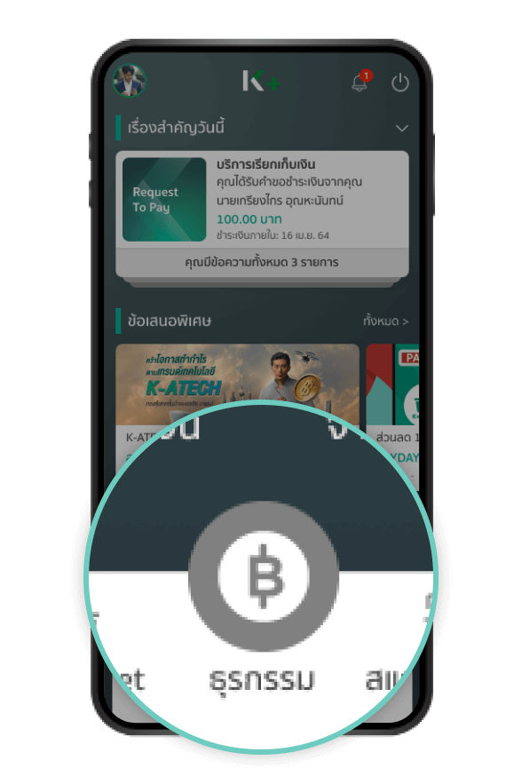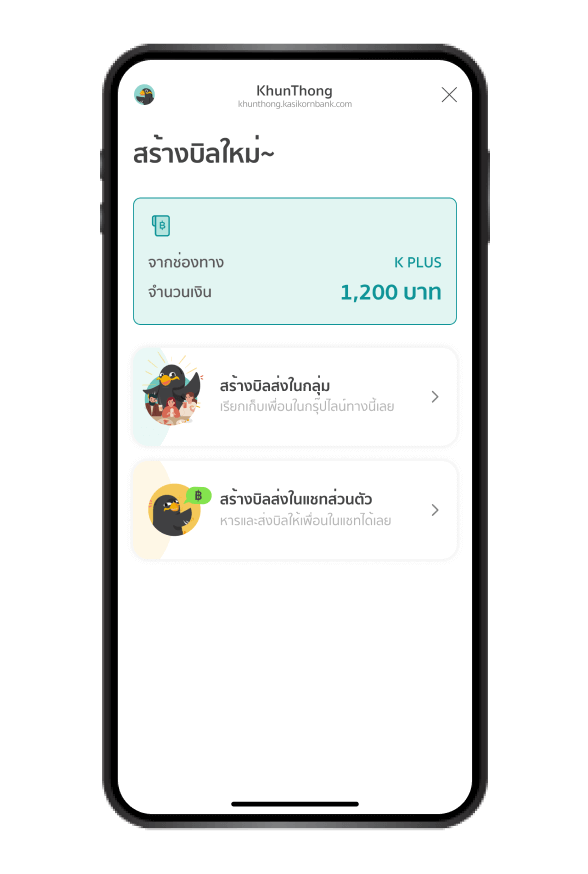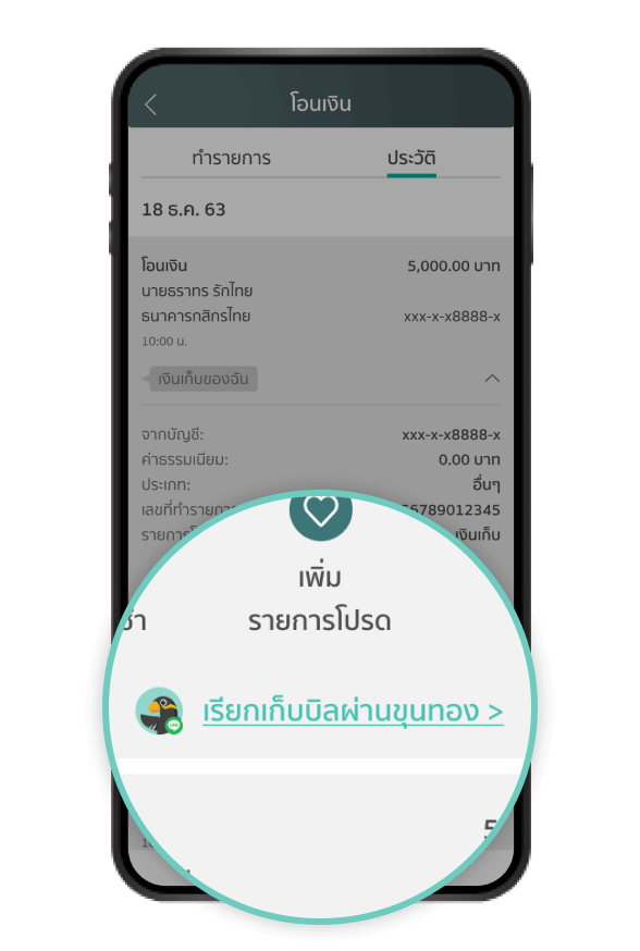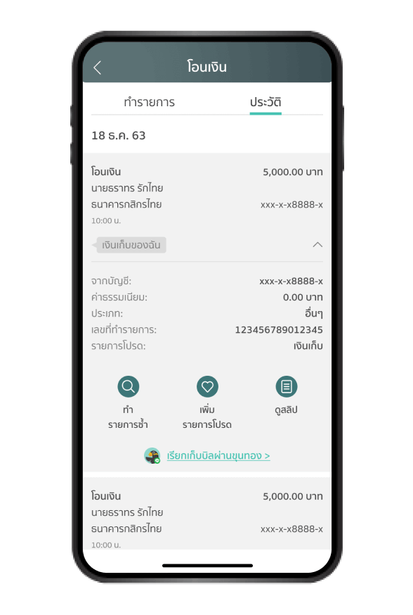จะรายการไหนที่โอนเงินหรือจ่ายบิลผ่าน K PLUS ไปก่อน ก็กลับมาหารบิลกับเพื่อนทีหลังได้ ขุนทองพร้อมช่วยหารบิลจากประวัติการทำรายการบน K PLUS ง่ายมาก ๆ แค่เข้าไปที่ ดูประวัติการโอนเงิน / จ่ายบิล เลือกรายการที่ต้องการหารบิลกับเพื่อน แล้วคลิกที่ปุ่มเรียกเก็บบิลกับขุนทอง บิลไหนก็ไม่มีพลาด สะดวก สบาย เรียกเก็บง่าย บน K PLUS *รายการที่ตรงตามเงื่อนไขที่ธนาคารกำหนด จะมี Logo ของขุนทองปรากฎอยู่ ตามภาพประกอบ
