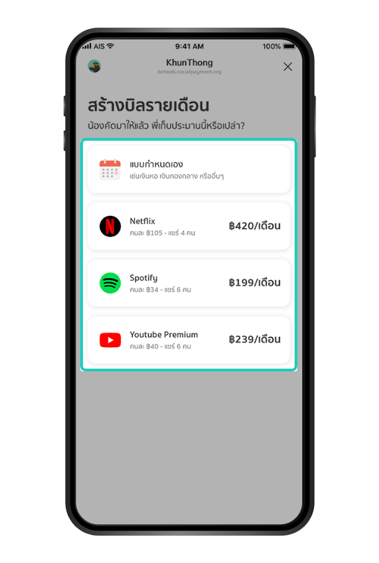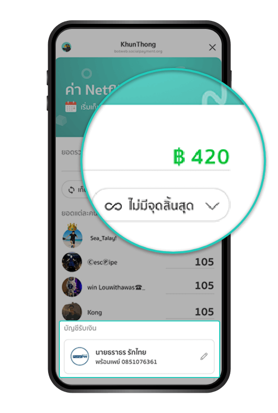ไม่ว่าจะค่าบ้าน ค่าหอ ค่าอินเทอร์เน็ต หรือ Subscriptions ดูหนัง ฟังเพลงเจ้าไหน จะแชร์กับเพื่อนหรือครอบครัว ก็ไม่ปัญหา ให้ขุนทองช่วยหารและตั้งเรียกเก็บล่วงหน้าได้ง่าย ๆ แค่พิมพ์ #เก็บรายเดือน หรือ พิมพ์ขุนทองและเลือกเก็บรายเดือน ก็เตือนจ่ายให้ทุกเดือน สบายใจได้ ไม่ต้องกลัวลืม