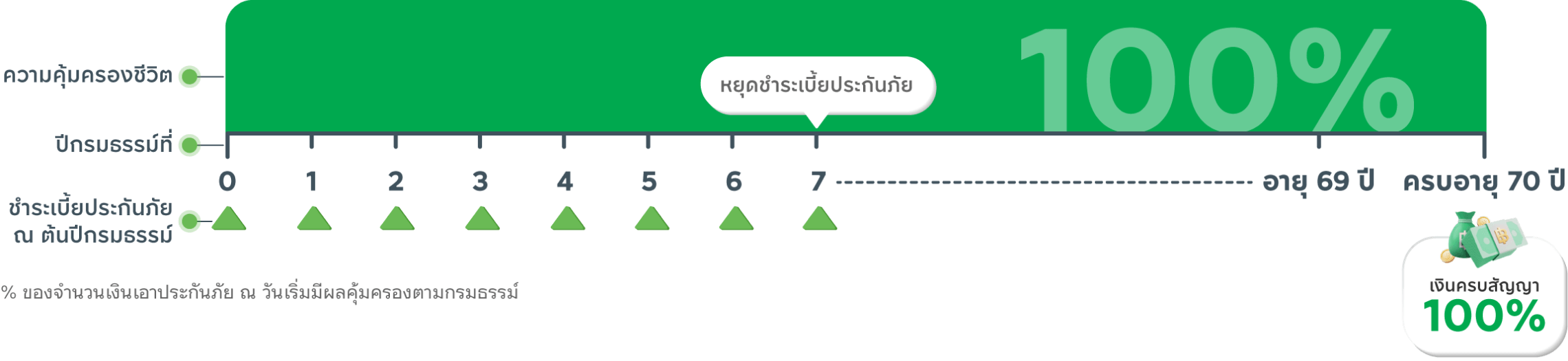 สิ้นปีกรมธรรม์ที่ ครบอายุ 70 รับเงินครบกำหนดสัญญา 100%*