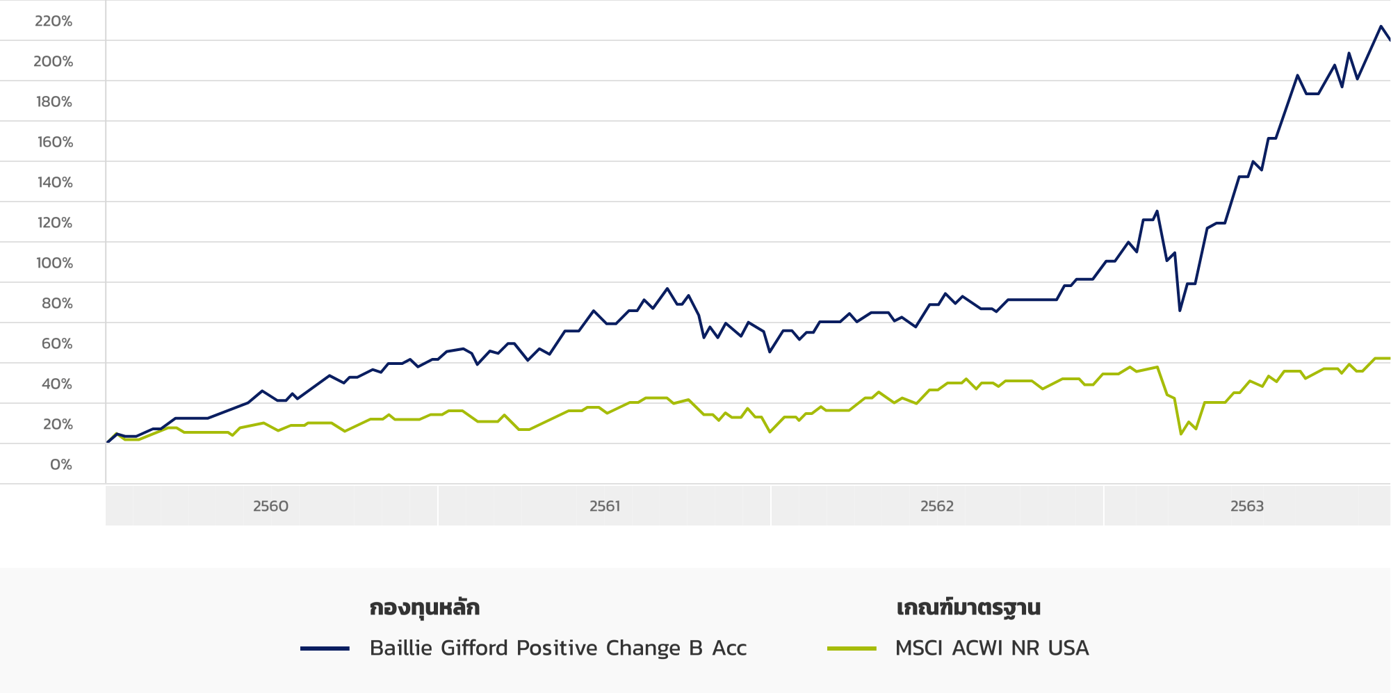 ลงทุนผ่านกองทุนหลัก Baillie Gifford Positive Change Fund - Class B accumulation (GBP) บริษัทจัดการโดย Baillie Gifford ที่มีประสบการณ์ในการบริหารกองทุนมายาวนาน มีทีมนักวิเคราะห์หุ้นกว่า 100 คนที่วิเคราะห์ข้อมูลเชิงลึกของบริษัทที่น่าสนใจทั่วโลก