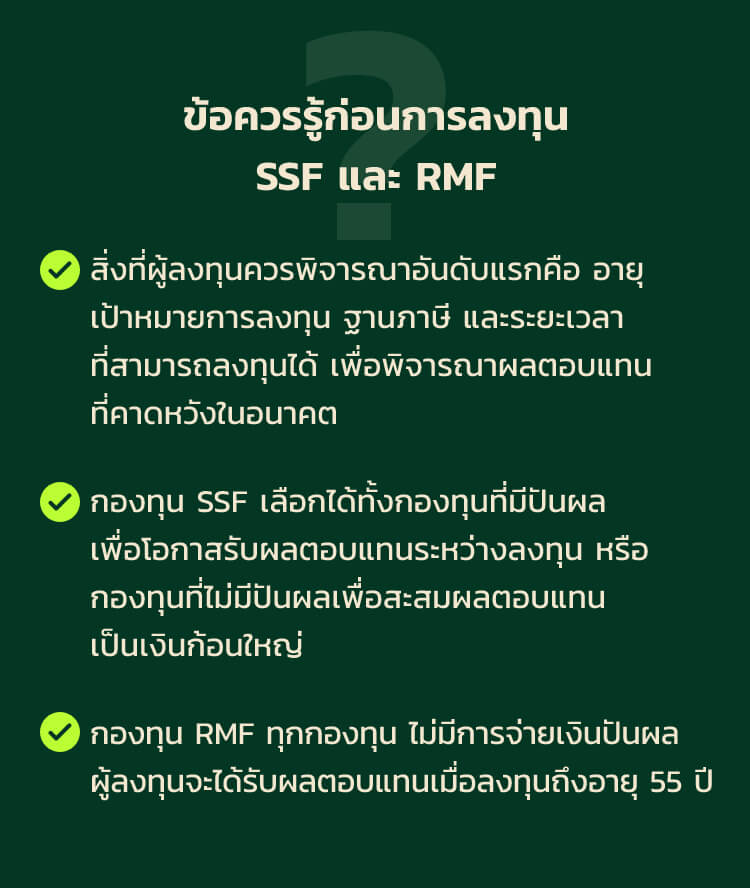 ขึ้นอยู่กับฐานภาษีของผู้ลงทุน และจำนวนเงินลงทุนในกองทุนสำรองเลี้ยงชีพ รวมถึงผู้ลงทุนควรพิจารณาระยะเวลาที่สามารถลงทุนได้ เนื่องจากกองทุน SSF ห้ามขายคืนก่อน 10 ปี และกองทุน RMF ห้ามขายคืนก่อนอายุ 55 ปี