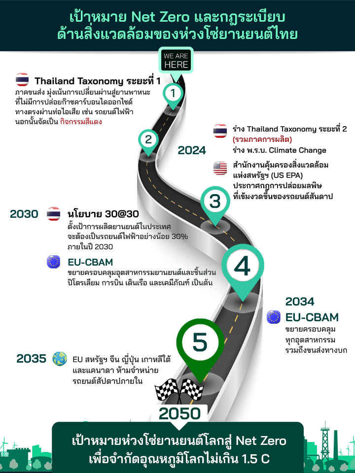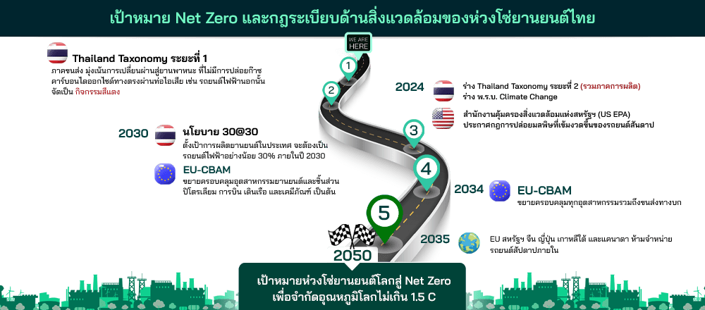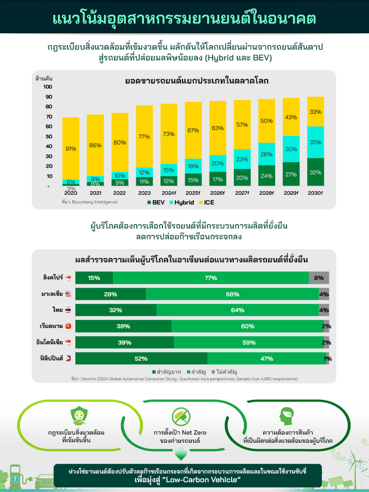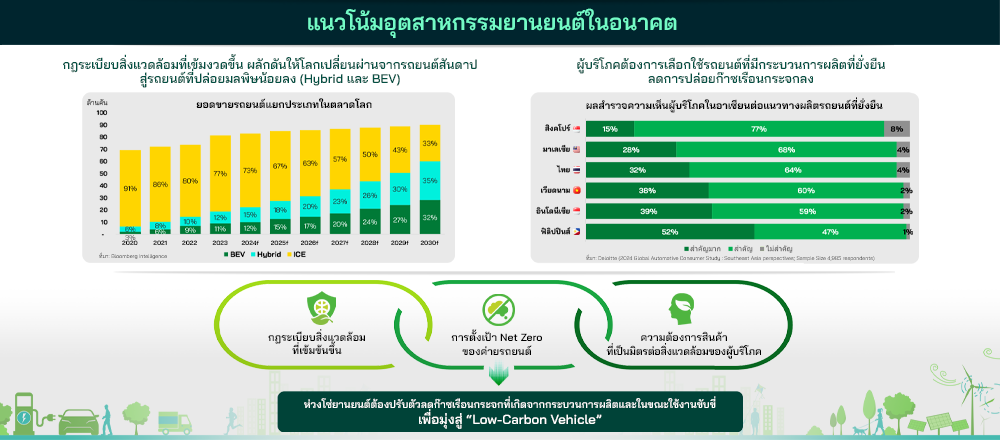 แรงผลักดันจากปัจจัยในด้านต่างๆ เช่น มาตรการและกฎระเบียบด้านสิ่งแวดล้อมโลก ความต้องการของผู้บริโภค รวมไปถึงกลยุทธ์และเป้าหมายการลดก๊าซเรือนกระจกจากบริษัทในอุตสาหกรรมยานยนต์ระดับโลก มีผลกระทบให้อุตสาหกรรมยานยนต์ในประเทศไทยต้องปรับตัว