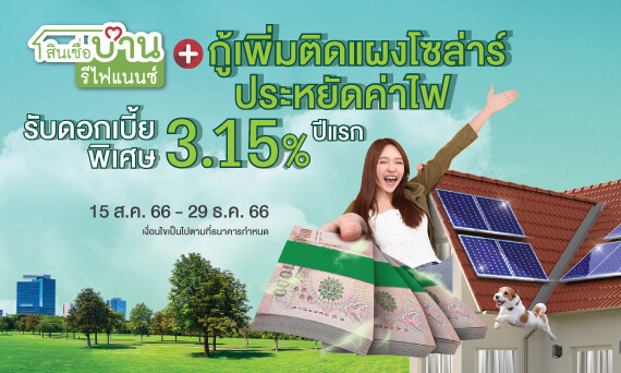 รับอัตราดอกเบี้ยพิเศษ วงเงินรีไฟแนนซ์บ้าน 3.15% ปีแรก วงเงินกู้เพิ่มติดโซลาร์ อัตราดอกเบี้ยเฉลี่ย 3 แรก 4.09% กู้ได้ 100% ของราคาประเมิน