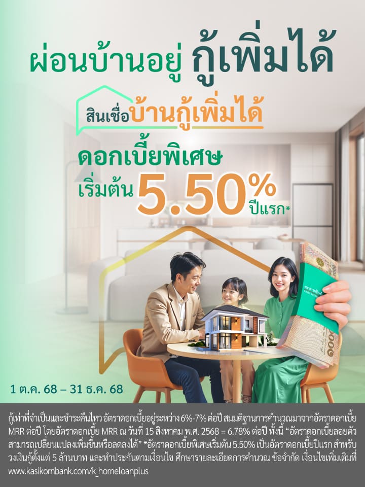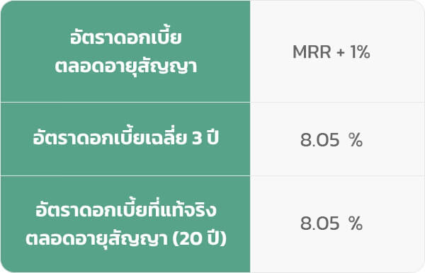สมมติฐานการคำนวณมาจากอัตราดอกเบี้ย MRR ต่อปี โดยอัตราดอกเบี้ย MRR ณ วันที่ 15 สิงหาคม 2568 = 6.78% ต่อปี ทั้งนี้ “อัตราดอกเบี้ยลอยตัวสามารถเปลี่ยนแปลงเพิ่มขึ้นหรือลดลงได้” อัตราดอกเบี้ย MRR ให้อ้างอิงอัตราดอกเบี้ยตามประกาศของธนาคาร ณ วันที่ลูกค้ายื่นใบสมัครสินเชื่อ