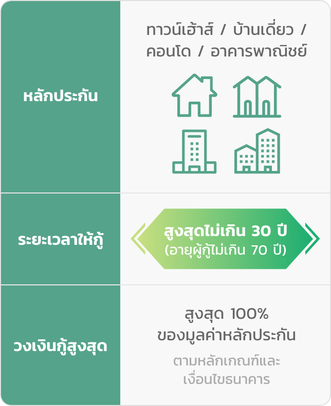 | ระยะเวลาให้กู้ | สูงสุดไม่เกิน 30 ปี (อายุผู้กู้ไม่เกิน 70 ปี) |