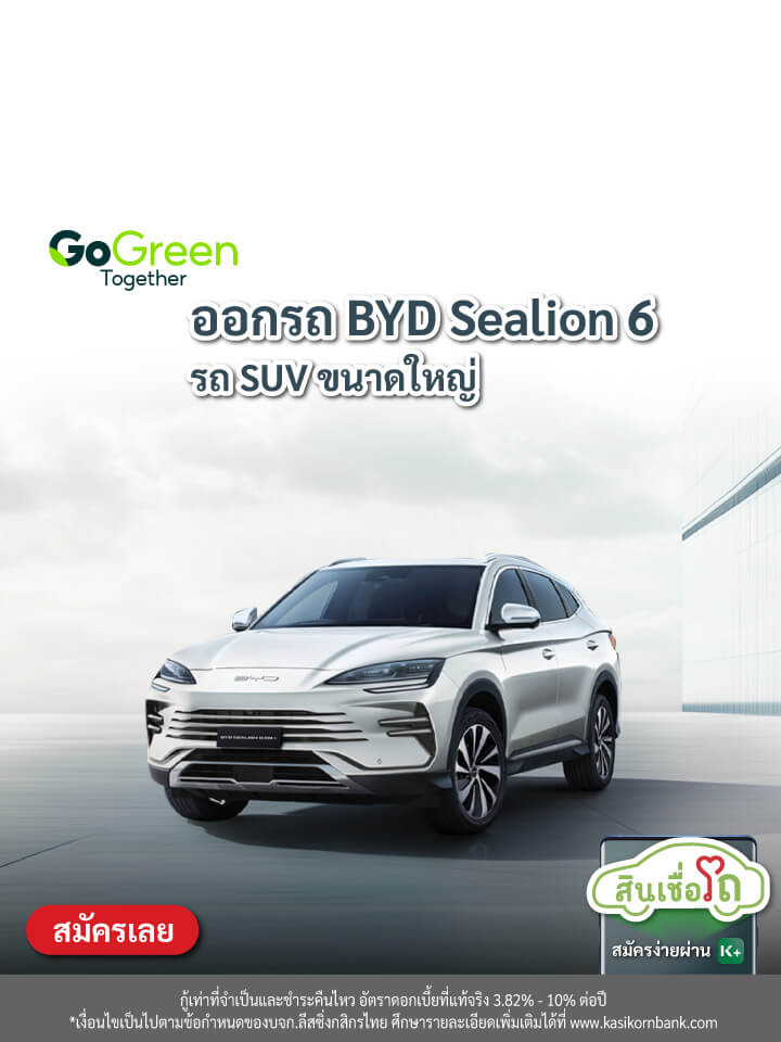 - สำหรับลูกค้าที่สมัครสินเชื่อรถใหม่ ผ่านช่องทาง K EV Shop กับ บริษัท ลีสซิ่งกสิกรไทย จำกัด (บริษัทฯ) ยี่ห้อ BYD รุ่น Sealion 6