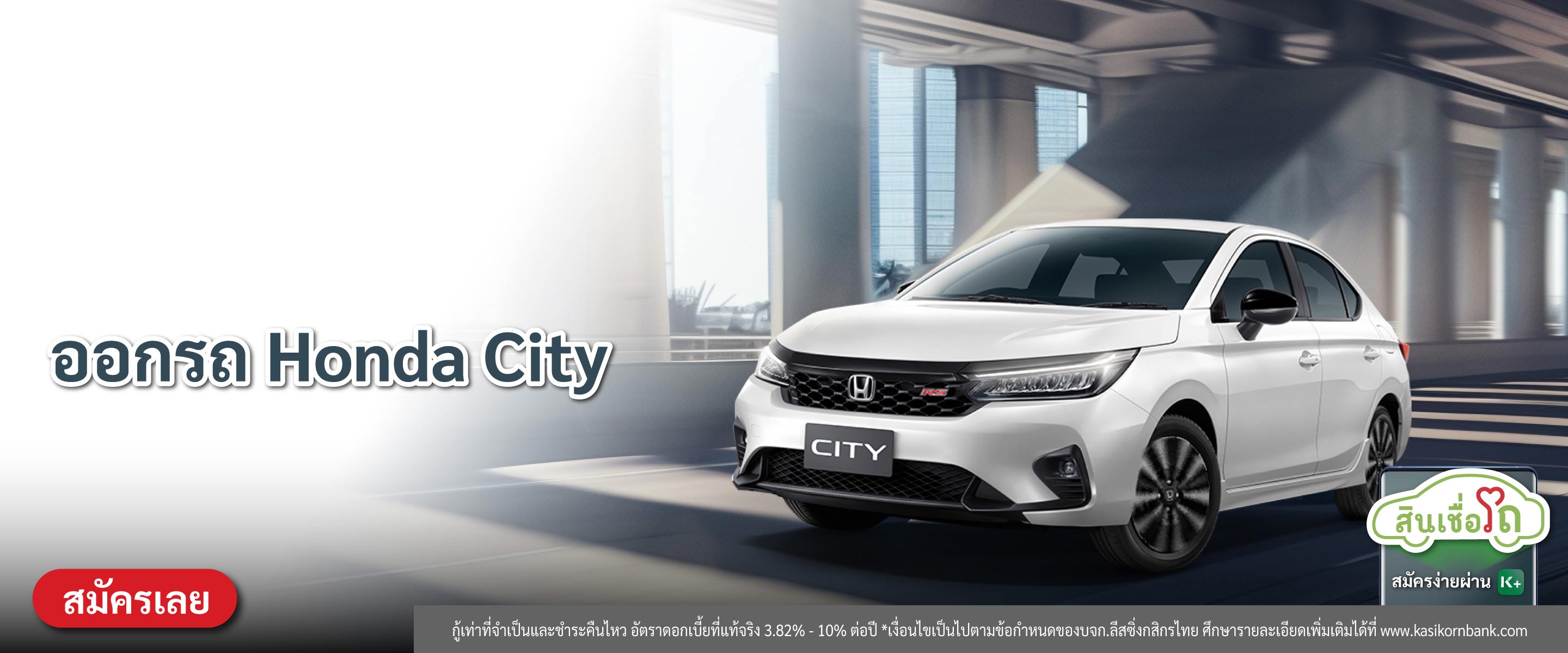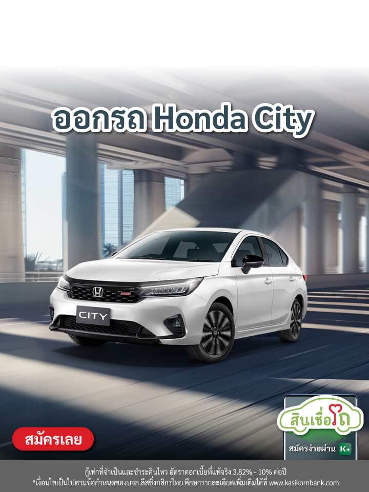 - สำหรับลูกค้าที่สนใจสมัครสินเชื่อ (รถใหม่) ผ่านช่องทาง K EV Shop กับ บริษัท ลีสซิ่งกสิกรไทย จำกัด ยี่ห้อ Honda รุ่น City