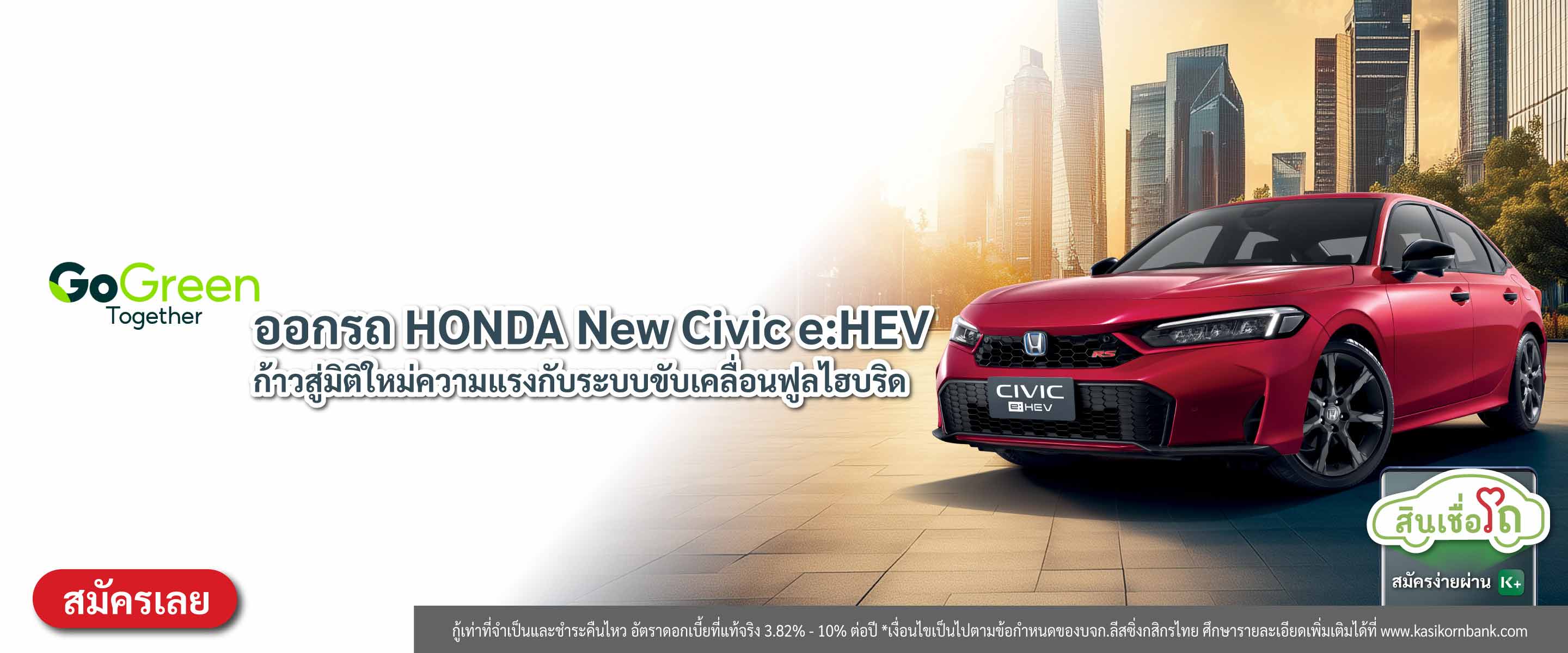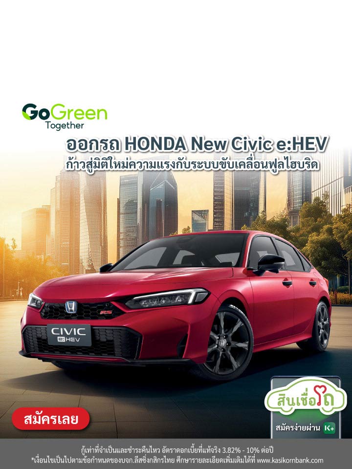 - สำหรับลูกค้าที่สนใจสมัครสินเชื่อ (รถใหม่) ผ่านช่องทาง K EV Shop กับ บริษัท ลีสซิ่งกสิกรไทย จำกัด ยี่ห้อ Honda รุ่น New Civic e:HEV
