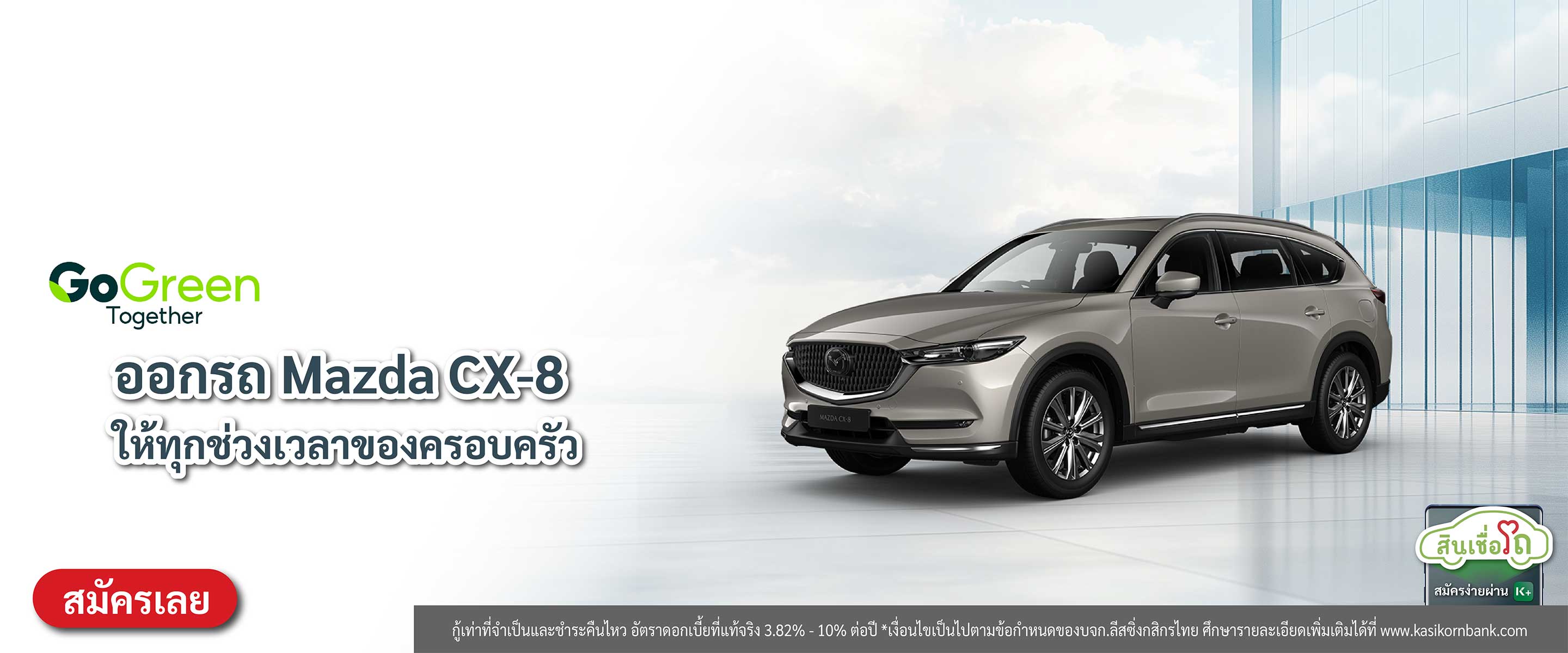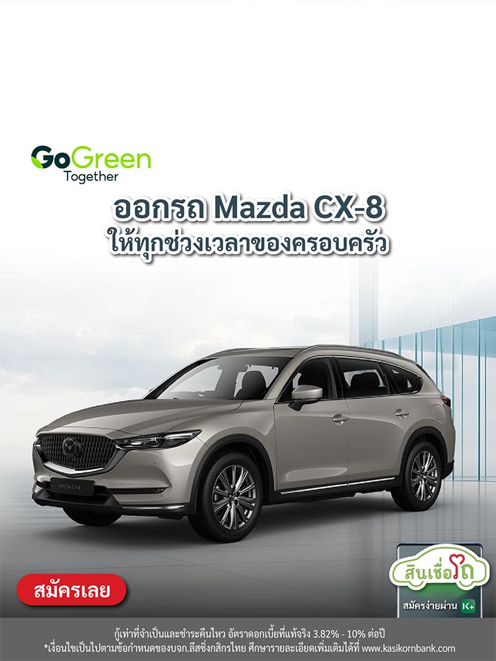 สำหรับลูกค้าที่สนใจสมัครสินเชื่อ (รถใหม่) ผ่านช่องทาง K EV Shop กับ บริษัท ลีสซิ่งกสิกรไทย จำกัด ยี่ห้อ Mazda รุ่น CX-8