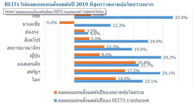 ด้วยทิศทางดอกเบี้ยโลกที่ลดลง พร้อมๆกับตลาดโลกที่ยังคงผันผวนสูงอันปกคลุมไปด้วยความกังวลเรื่องเศรษฐกิจโลกที่ชะลอตัวลง ทำให้การแสวงหาผลตอบแทนทำได้ยากขึ้น แต่ก็ยังมีอยู่หนึ่งสินทรัพย์ที่ดูแล้วจะเป็นพระเอกของการลงทุนปี 2019 นั่นก็คือ REITs หรือทรัสต์เพื่อการลงทุนในอสังหาริมทรัพย์ที่ให้ผลตอบแทนอันน่าสนใจไม่ว่าจะเป็น REITs ของประเทศหรือภูมิภาคไหนก็ตาม อย่างดัชนี SETPREIT ก็ให้ผลตอบแทนรวมไปแล้ว 33.4% ตั้งแต่ต้นปีที่ผ่านมา เทียบกับดัชนี SET ที่ให้ผลตอบแทนรวมที่ 5.6% เนื่องจาก 1) REITs ถูกมองเป็นหุ้น Defensive ที่ราคาจะผันผวนน้อยกว่าหุ้นในกลุ่มธุรกิจอื่นๆ ดังนั้นมักจะเป็นหลุมหลบภัยในช่วงตลาดหุ้นผันผวนสูง และ 2) แนวโน้มดอกเบี้ยขาลงมักหนุน REITs เนื่องจากนักลงทุนจะมองหาผลตอบแทนเพิ่มเติม โดยวิ่งหาเงินปันผลซึ่งโดยปกติแล้ว REITs มักจะจ่ายเงินปันผล หรือ Dividend Yield ในอัตราที่สูง และสม่ำเสมอ