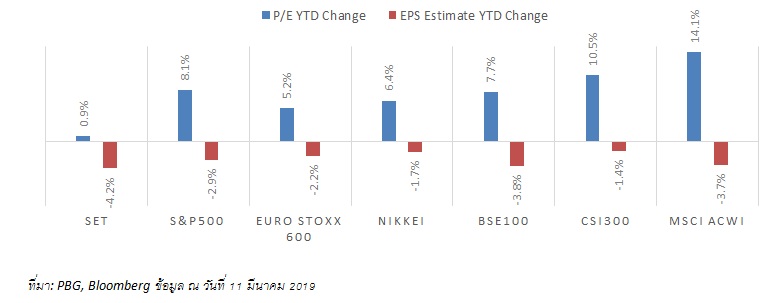 ท่ามกลางการชะลอตัวลงของเศรษฐกิจโลก สังเกตเห็นได้จากกิจกรรมของภาคธุรกิจที่อ่อนแรงลง โดยเฉพาะปริมาณการค้า และการผลิตภาคอุตสาหกรรม ที่ได้รับผลกระทบจากข้อพิพาททางการค้าและอุปสงค์โลกที่เติบโตน้อยลง ทั้งนี้ ดัชนีผู้จัดการฝ่ายจัดซื้อภาคการผลิต หรือ Manufacturing PMI ในเดือนกุมภาพันธ์ได้เข้าสู่เกณฑ์หดตัว (ต่ำกว่า 50 จุด) ในหลายๆ ประเทศ เช่น ยุโรป ญี่ปุ่น จีน เกาหลีใต้ รวมถึงไทย นอกจากนี้ ระดับกำไรสุทธิของบริษัทจดทะเบียนในประเทศต่างๆ เกือบทั่วโลกก็ถูกปรับคาดการณ์การเติบโตลดลงอย่างต่อเนื่องตั้งแต่ต้นปีที่ผ่านมา บ่งบอกถึงแนวโน้มเศรษฐกิจโลกที่ต้องระมัดระวังมากขึ้น เป็นเหตุผลสำคัญที่ทำให้ธนาคารกลางต่างๆ ออกมาส่งสัญญาณถึงทิศทางนโยบายการเงินที่ผ่อนคลายมากขึ้น นำโดยฝั่งธนาคารกลางสหรัฐฯ (FED) ที่นายเจอโรม พาวเวล ระบุว่าจะชะลออัตราความเร็วในการขึ้นดอกเบี้ยนโยบายสหรัฐฯ ในปี 2019 เหลือเพียง 2 ครั้ง (จากปี 2018 ที่ขึ้นดอกเบี้ยมาแล้วถึง 4 ครั้ง) ทั้งนี้ ตลาดกลับเชื่อว่า FED จะไม่ปรับขึ้นอัตราดอกเบี้ยสหรัฐฯ ในปีนี้เลยด้วยซ้ำ รวมถึงมีโอกาสที่ FED จะลดดอกเบี้ยนโยบายลงในปี 2020 ส่งผลให้ตลาดคลายความกังวลเรื่องความตึงตัวในตลาดการเงินโลกและลดโอกาสของการเกิดวิกฤตเศรษฐกิจในครั้งถัดไป ทำให้ราคาสินทรัพย์เสี่ยงอย่างหุ้นทั่วโลกรีบาวน์กลับขึ้นมาอย่างรวดเร็ว และลบล้างผลขาดทุนในบางตลาดในช่วงปี 2018 ได้ภายในเวลาเพียง 2 เดือนเท่านั้น โดยราคาหุ้นโลกที่ปรับขึ้นมารอบนี้ได้แรงหนุนจากสภาพคล่องที่สูงขึ้นมากกว่าปัจจัยพื้นฐานหรือและกำไรสุทธิที่แข็งแกร่งขึ้น นั่นหมายถึง นักลงทุนซื้อหุ้นโลกในราคาที่สูงขึ้น และอัตราส่วนราคาต่อกำไรสุทธิ (Price-to-Earnings: P/E Ratio) พุ่งขึ้นจาก 13.4 เท่า ในช่วงสิ้นปี 2018 มาซื้อขายอยู่ที่ 14.9 เท่า ในปัจจุบัน
