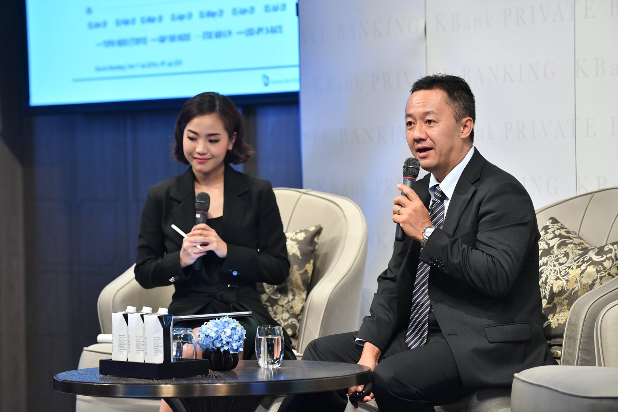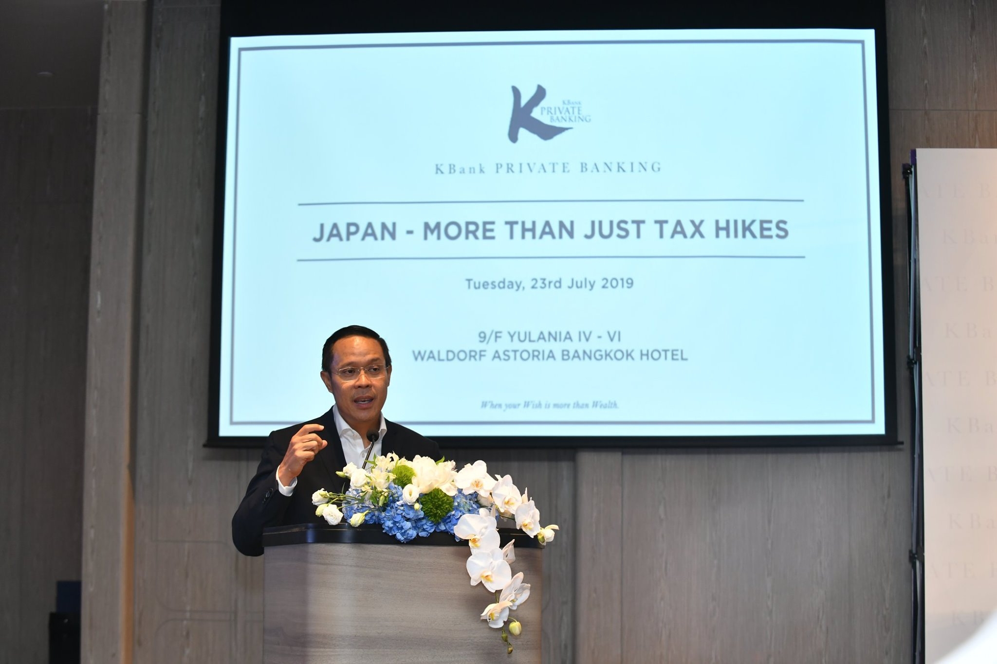 ณ ห้อง YULANIA IV - VI โรงแรม Waldorf Astoria Bangkok นายสุวัฒน์ เตชะวัฒนวรรณา รองกรรมการผู้จัดการ ธนาคารกสิกรไทย กล่าวต้อนรับลูกค้าในงาน Japan – More Than Just Tax Hikes ซึ่งจัดให้แก่ลูกค้า High Net Worth จำนวน 40 คน ภายใต้รูปแบบงานสัมมนา แนะนำและอัพเดทสถานการณ์ของกองทุน โดยผู้จัดการกองทุนของ Sumitomo Mitsui Asset Management เพื่อสร้างประสบการณ์สุดพิเศษให้แก่ลูกค้าKBank PRIVATE BANKING