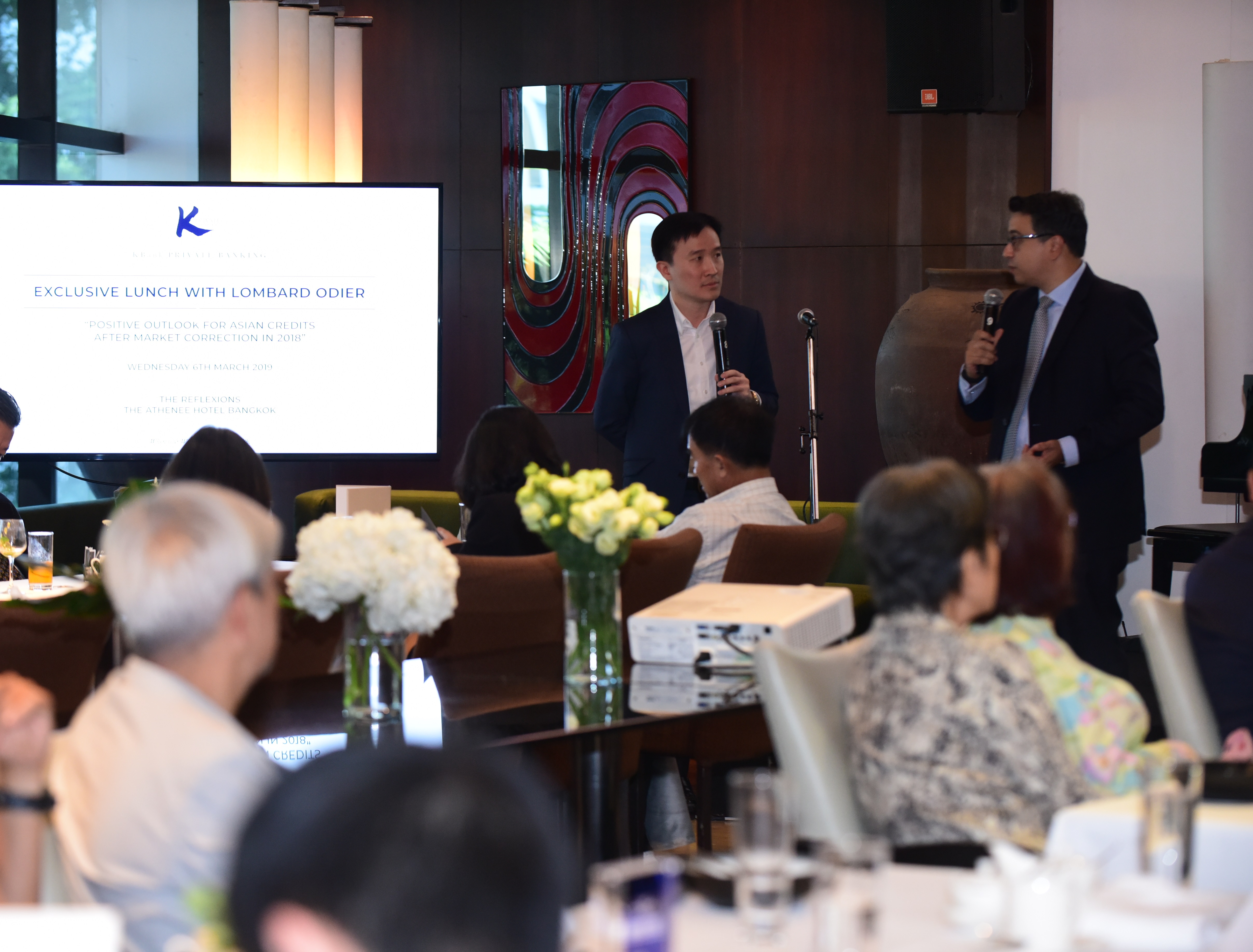 ณ THE REFLEXIONS ห้องอาหารฝรั่งเศสของโรงแรม The Athénée Hotel Bangkok คุณศิริพร สุวรรณการ Managing Director - Private Banking Financial Advisory Head, Private Banking Group กล่าวต้อนรับลูกค้าในงาน EXCLUSIVE LUNC WITH LOMBARD ODIER ซึ่งจัดให้แก่ลูกค้า HN จำนวน 40 คน ภายใต้รูปแบบงานสัมมนา แนะนำและอัพเดทสถานการณ์ของกองทุน โดยผู้จัดการกองทุนของ LOMBARD ODIER เพื่อสร้างประสบการณ์สุดพิเศษให้แก่ลูกค้า