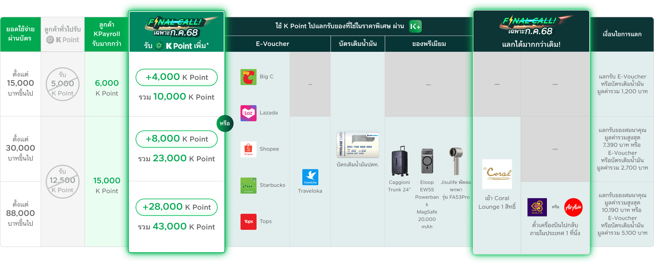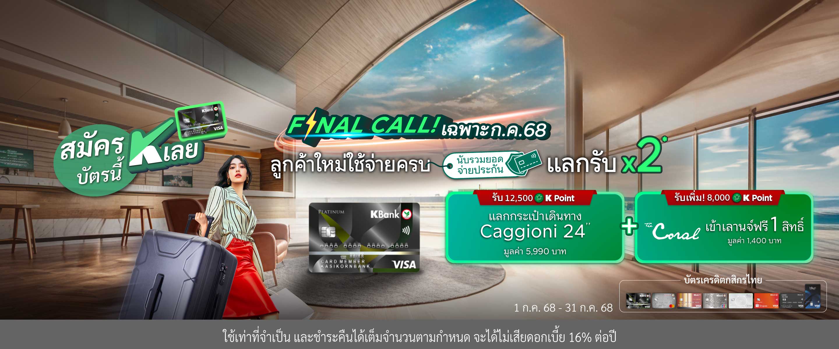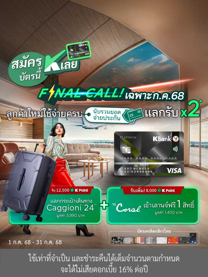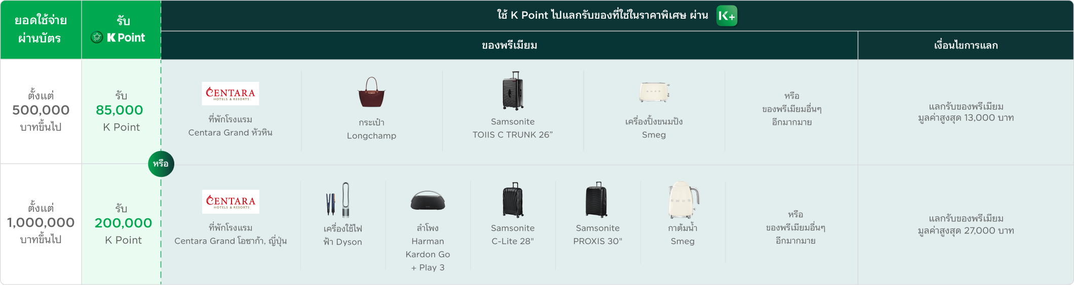 เงื่อนไขการได้รับคะแนนสะสม K Point และเงื่อนไขการใช้บัตรเครดิต เป็นไปตามที่ธนาคารกำหนด