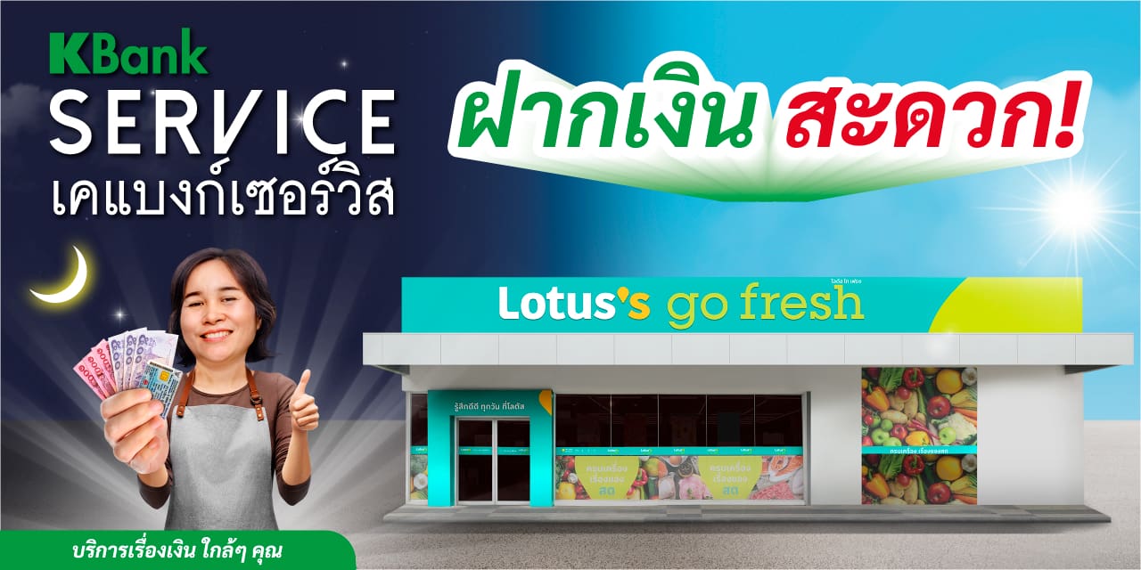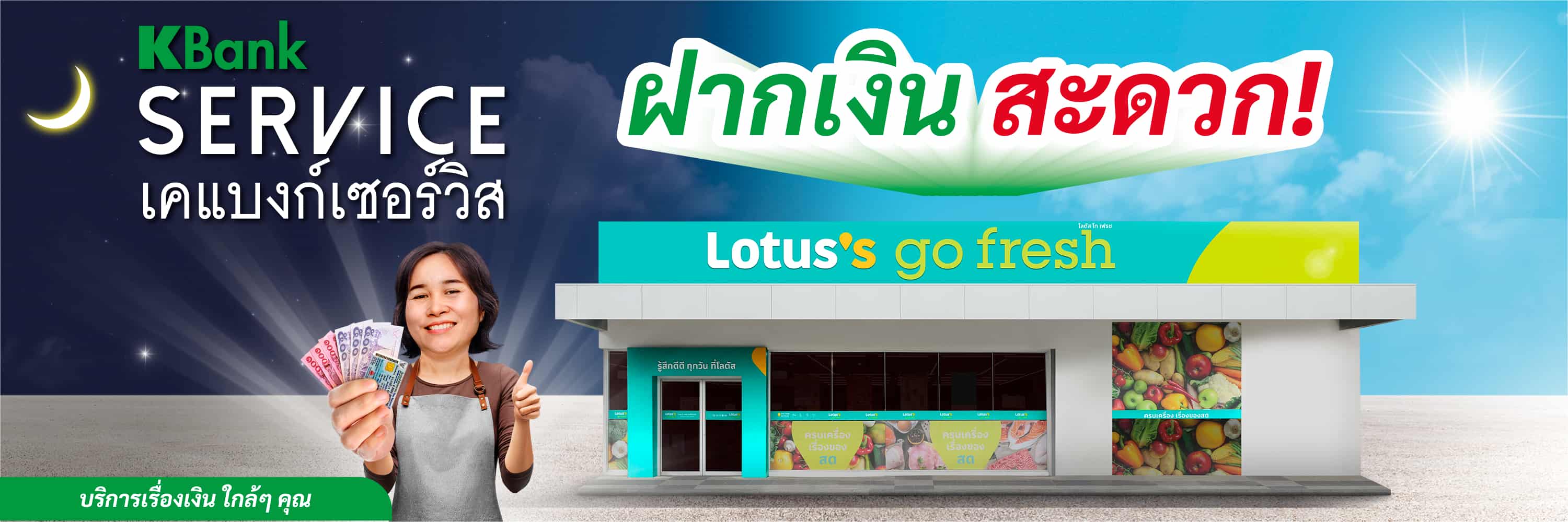 บริการทำธุรกรรมทางการเงินผ่านโลตัส (Lotus’s) เพิ่มความสะดวกในการทำธุรกรรมทางเงินสดให้กับลูกค้าของธนาคารให้บริการฝากเงินสดเข้าบัญชีกสิกรไทยที่โลตัส (Lotus’s) ทุกสาขา เวลา 00.01 - 23.30 น.