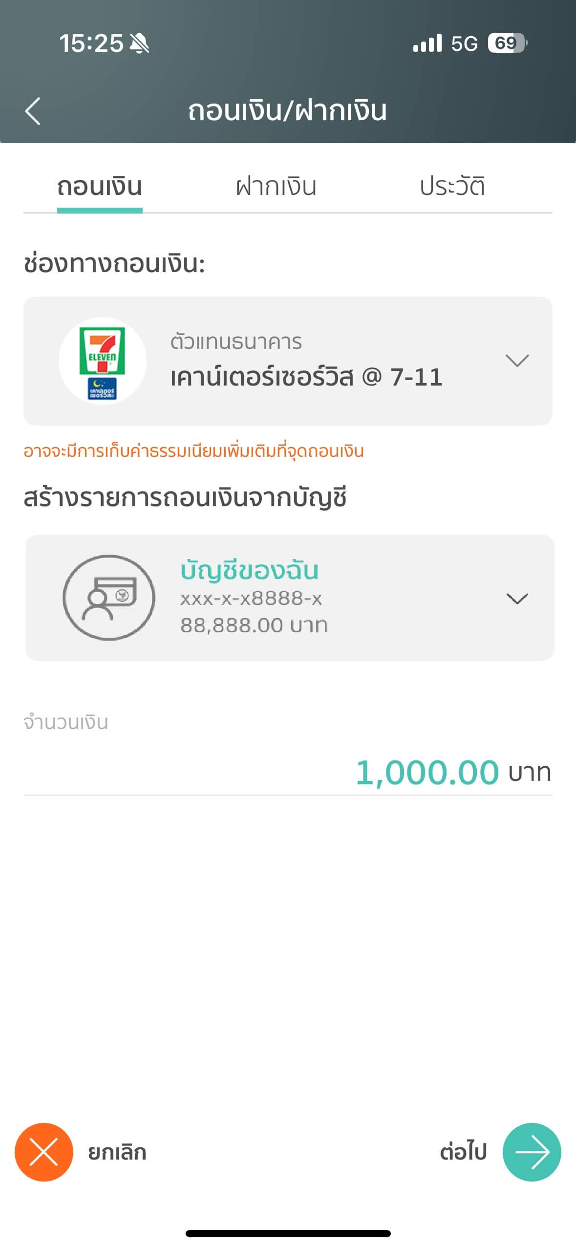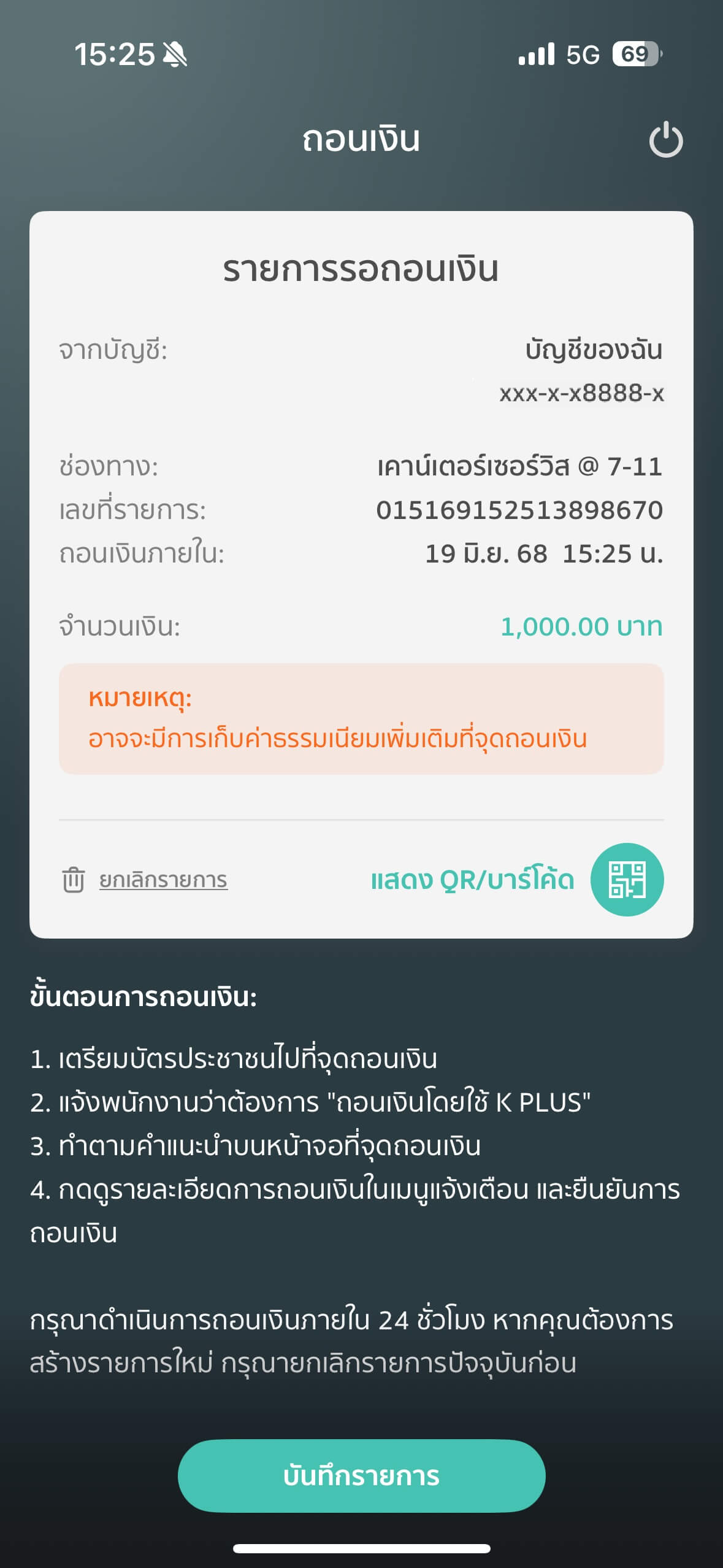 – 5,000 บาท ต่อรายการ ต่อวัน ต่อหมายเลขบัตรประชาชน ถอนเงินได้เฉพาะบัญชีออมทรัพย์ และบัญชีกระแสรายวัน ธนาคารกสิกรไทยเท่านั้น