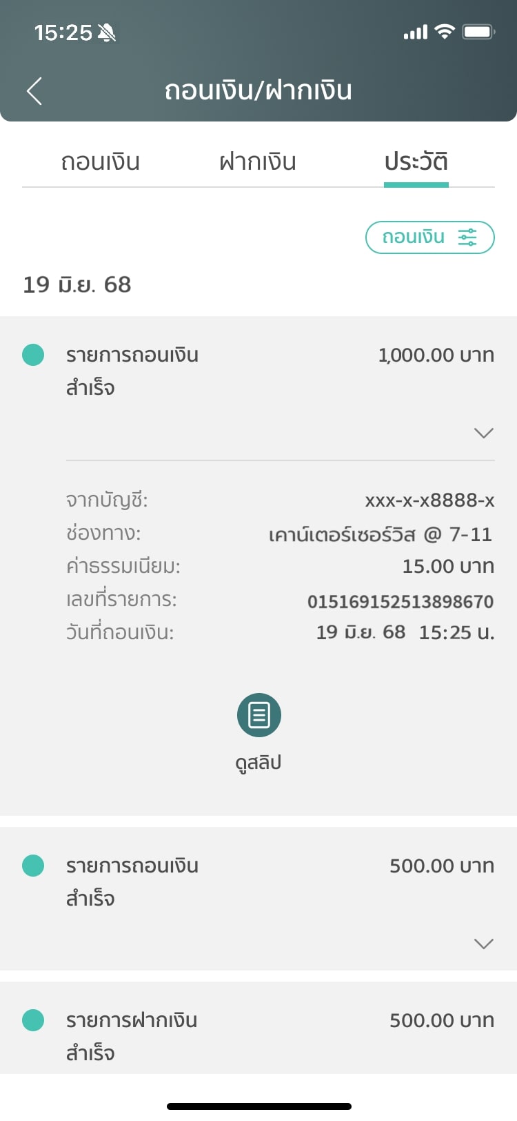 สามารถ "เรียกดูรายละเอียดการถอนเงิน" ได้ที่ประวัติ