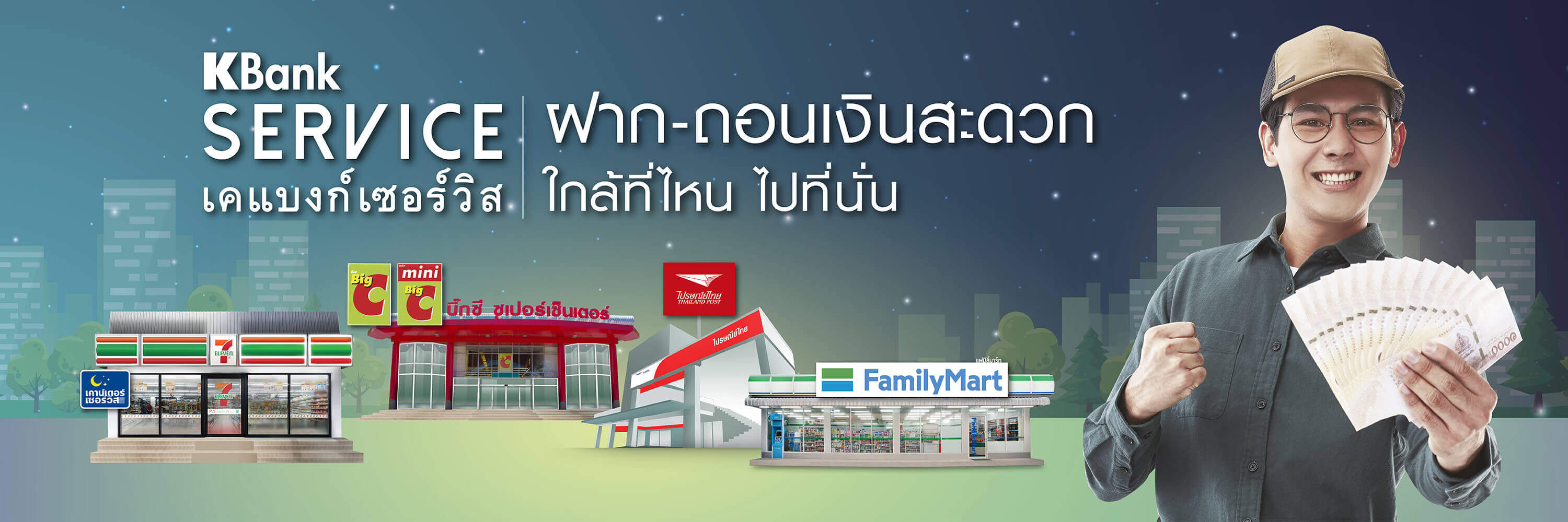 - บริการฝากเงินเข้าบัญชีธนาคารกสิกรไทย จำกัด (มหาชน) KBank Service ที่เคาน์เตอร์เซอร์วิสในร้าน 7-Eleven (เฉพาะสาขาที่ร่วมรายการ) ฝากเงินสดตั้งแต่ 1-30,000 บาท/รายการ สูงสุด 100,000 บาท / วัน / บัญชี ฝากเงินเข้าได้เฉพาะบัญชีออมทรัพย์และบัญชีกระแสรายวัน ธนาคารกสิกรไทยเท่านั้น ค่าธรรมเนียมการฝากเงิน KBank Service รายการละ 15 บาท หรือ บริการถอนเงินจากบัญชีธนาคารกสิกรไทย จำกัด (มหาชน) KBank Service ที่เคาน์เตอร์เซอร์วิสในร้าน 7-Eleven (เฉพาะสาขาที่ร่วมรายการ) ถอนเงินสดตั้งแต่ 50-5,000 บาท/รายการ สูงสุด 20,000 บาท / วัน / คน ถอนเงินได้เฉพาะบัญชีออมทรัพย์และบัญชีกระแสรายวัน ธนาคารกสิกรไทยเท่านั้น ค่าธรรมเนียมการถอนเงิน KBank Service รายการละ 15 บาท